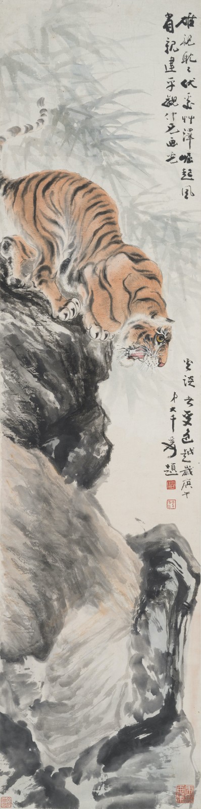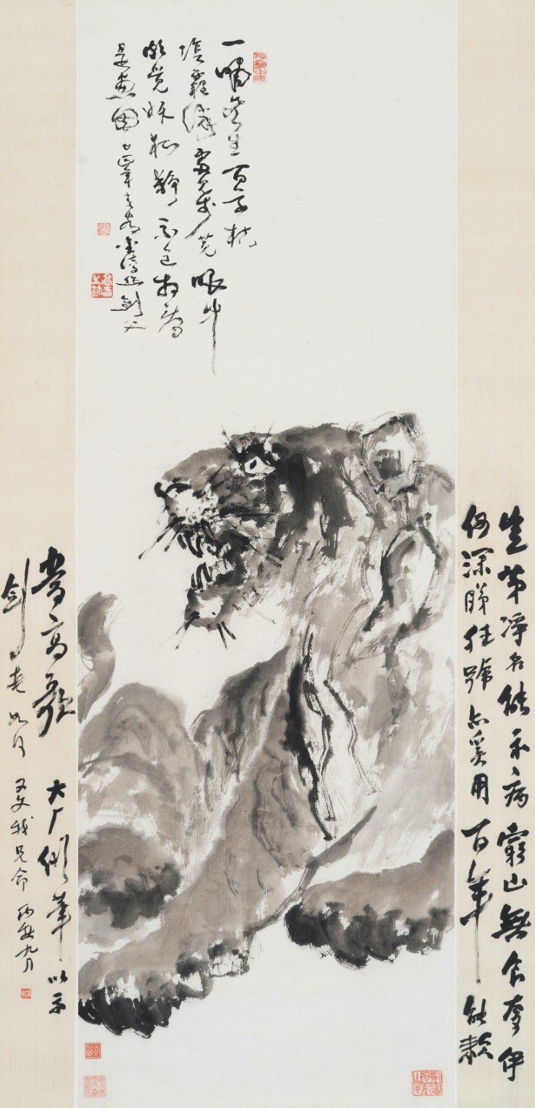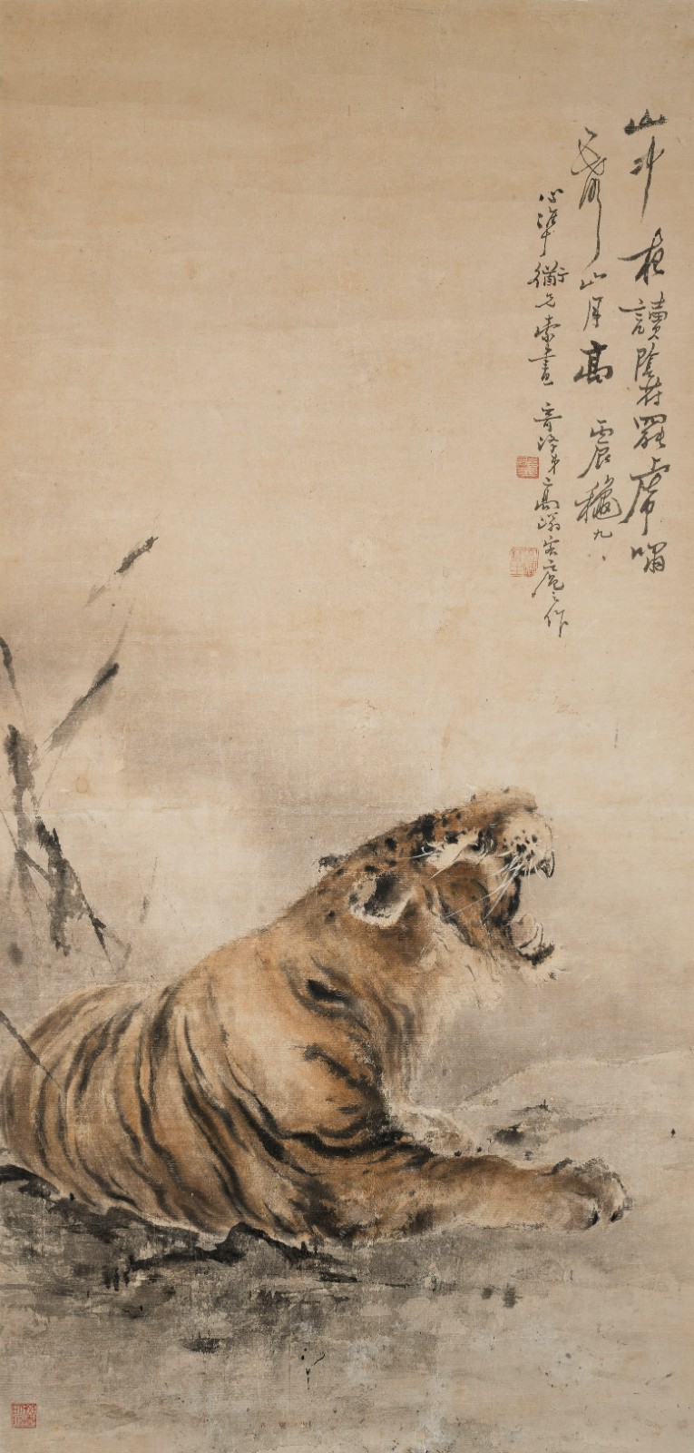 清末民初時期,廣東嶺南畫派開始崛起,當時嶺南畫家如高劍父、高奇峰、陳樹人等到日本留學,當地畫壇流行猛虎風氣,筆下的老虎兇猛、充滿獸性,並以月夜、寒冬作為背景,以凸顯老虎的殺氣。受日本畫壇影響,猛虎風氣也隨畫家留學歸來帶到中國。展品高奇峰的《夜嘯》描繪了老虎在夜晚咆哮場景,用上京都畫壇朦朧派的技法,渲染畫作背景成夜色,不同於傳統國畫的留白處理。作品筆法寫實,老虎嘴巴大張,展露鋒利的牙齒,予人深刻印象,配合畫中激昂的題詩,意境深遠。