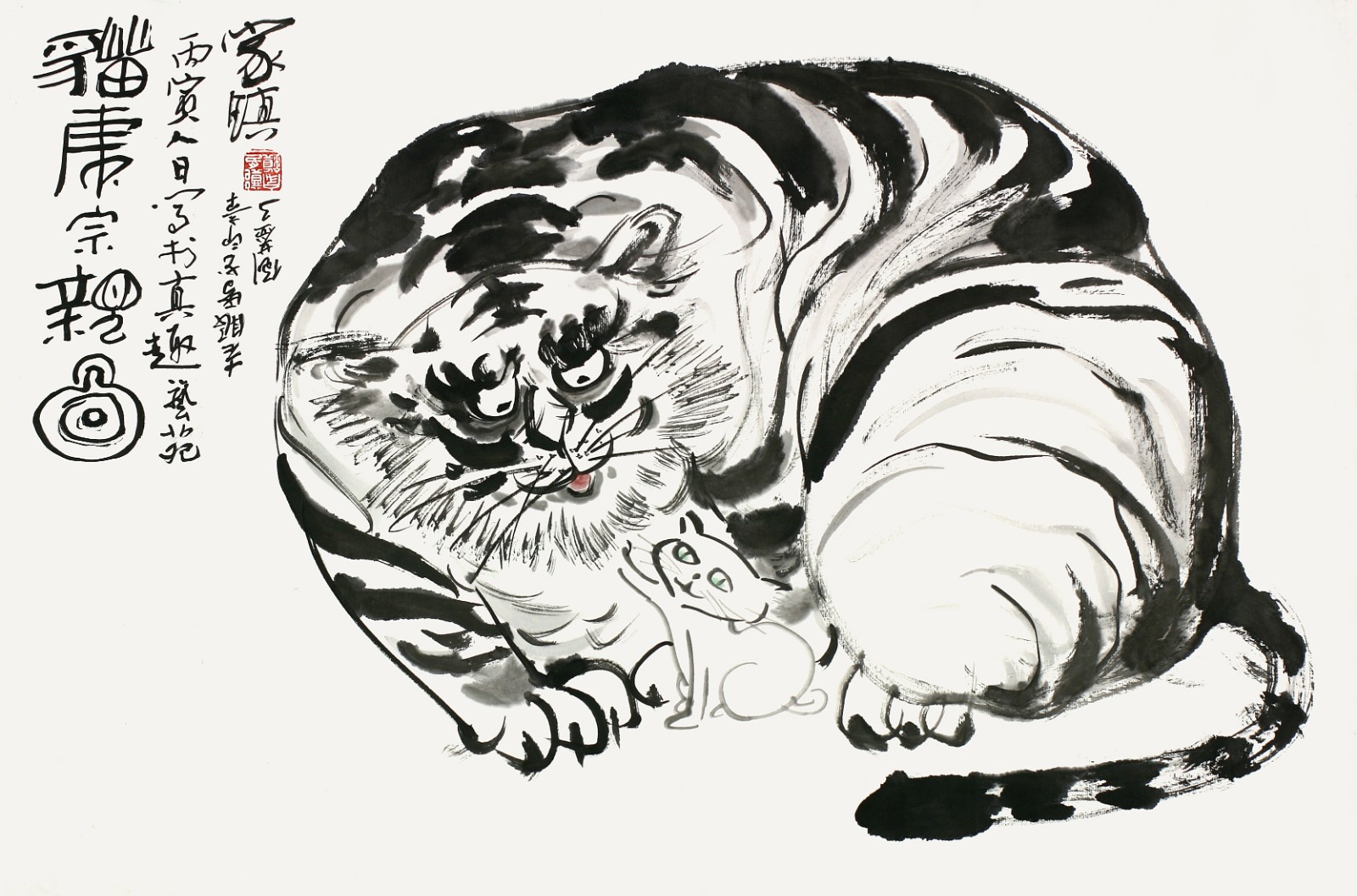 鄭家鎮作品《貓虎宗親圖》,1986年。作品虎與貓、大與小、花與白,形成了強烈對比,別具趣味。