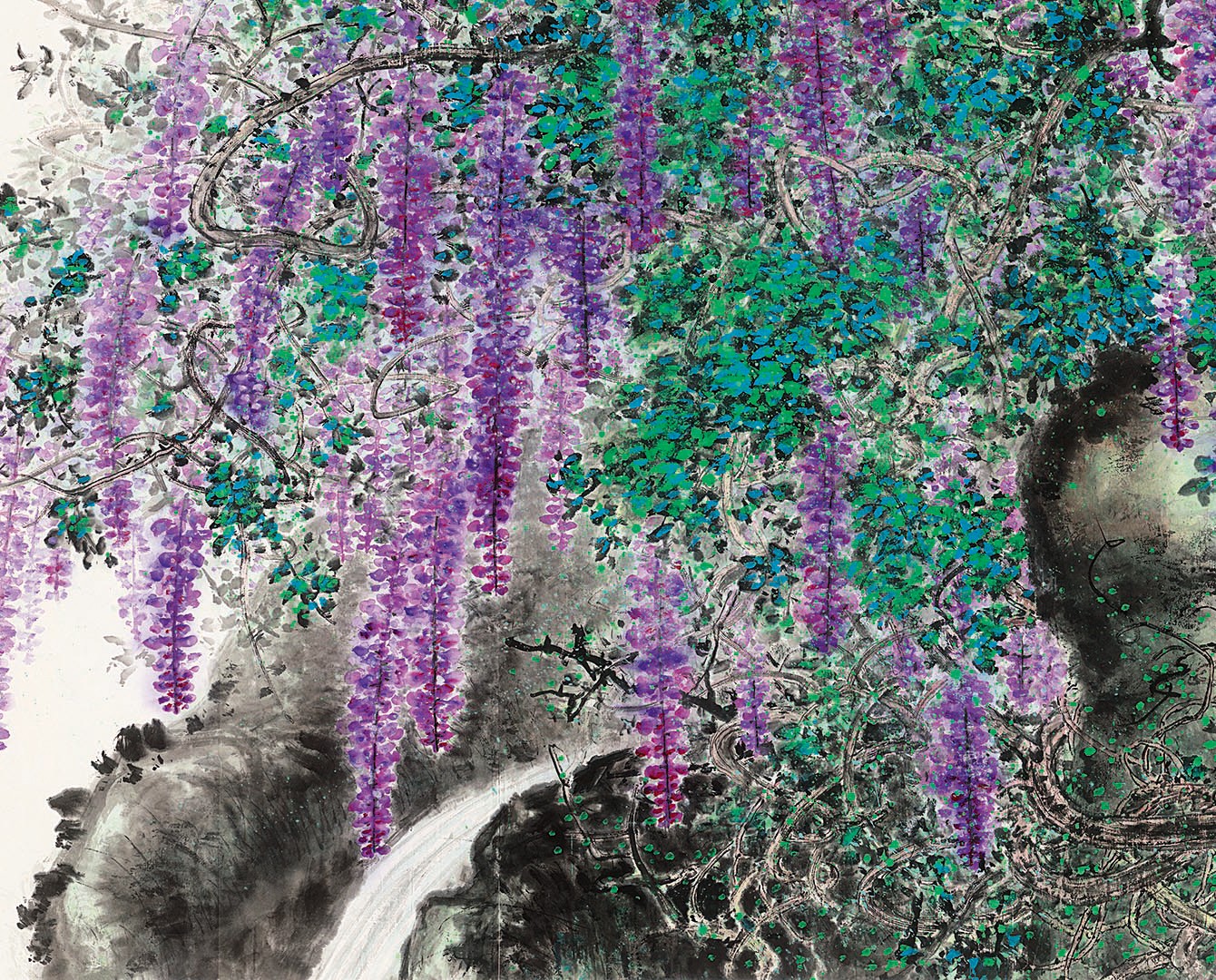 此畫難度最高之處在於尺幅巨大,而紫藤天然生就繁花密蕊,藤蔓交叉,綠葉密布,花穗飄逸,表現起來容易予人以重複單調之感。因此,畫家不僅要表現出紫藤的整體面貌,對於細節的刻畫也不可過於呆板,切忌整齊劃一。既要表現出細部的同與不同,又要使這些細節能夠統一協調於整體畫面,這是對畫家之筆墨功力、造型能力的巨大考驗。在此畫中,蕭暉榮並沒有迴避這個問題,而是刻意增加紫藤的密度,通過紫藤藤蔓的自然穿插,與花葉賦色的濃淡有別,營造出豐富的層次感,又適當地留下「氣孔」,使畫面不致太過擁滯,顯示出對於空間感的超強掌控能力。再者,表現藤葉和花瓣的綠色和紫色筆觸十分靈動,色塊變化多端,充分體現在微風吹拂下一片片藤葉妙曼婆沙,一串串藤花婀娜擺動,畫面充滿動感和韻律感,美不勝收,攝人心神。