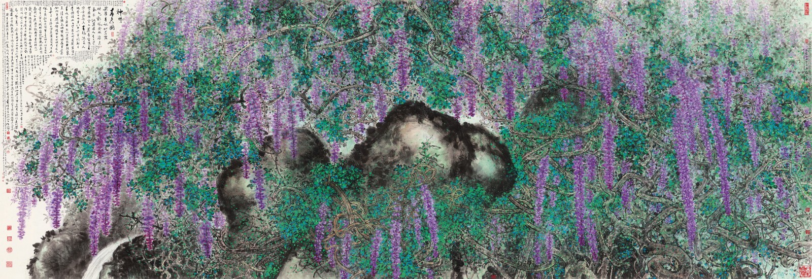 古往今來,紫藤之繁茂令人流連,所展現之生命力讓人為之傾倒。蕭暉榮曾於2005年春天在日本東京近郊觀賞千年紫藤,十分難忘,歸後曾作八尺全開古藤一幀,2010年再作丈八巨製《神州春色圖》,表現神州大地繁榮景象。畫家以花團錦簇比喻民族團結,祝願祖國欣欣向榮、繁華昌盛。畫中紫藤藤蔓如龍蛇般蜿蜒,濃淡有致的綠葉散發著生命力的光芒,一串串燦若雲霞的花穗垂掛枝頭,紫中帶藍,煞是好看。此畫筆墨蒼勁,行筆如行草書,瀟灑之中自然透出勁健渾厚的氣息;設色濃淡相宜,聚散有法,富有層次。