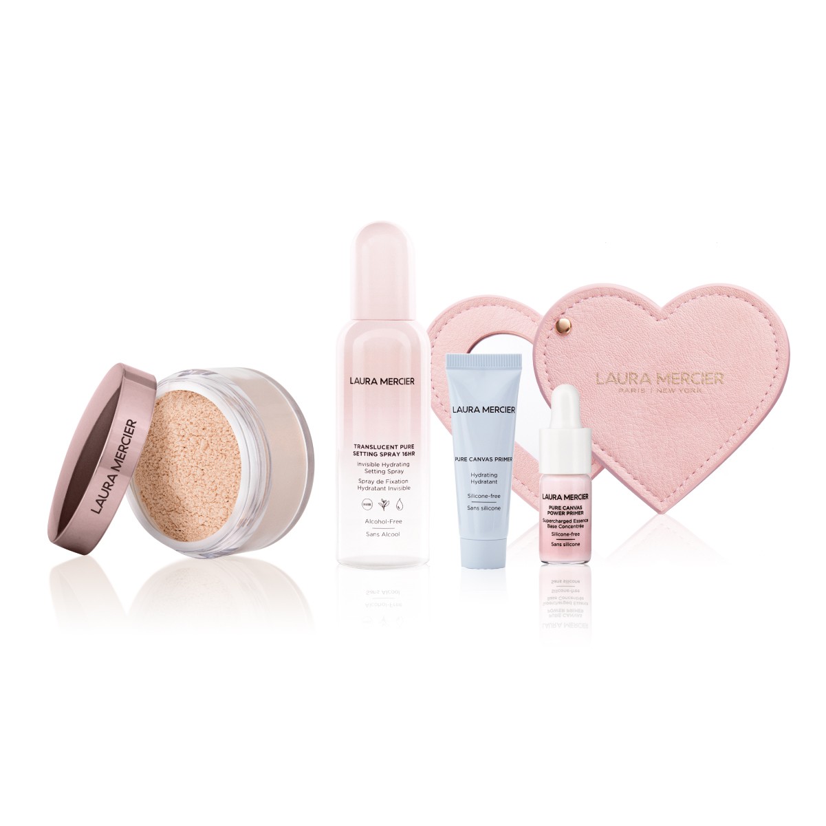雙效持久親膚定妝套裝HK$700 (價值HK$1040,門市及官網同步), 包括輕感親膚定妝噴霧100ml貨裝、粉嫩透亮蜜粉貨裝、極致持久水凝潤澤妝前底霜10ml、極致持久妝前活膚精華底霜3ml、Ian同款限量版心形鏡。