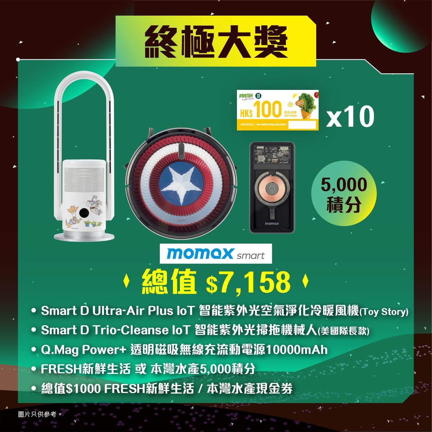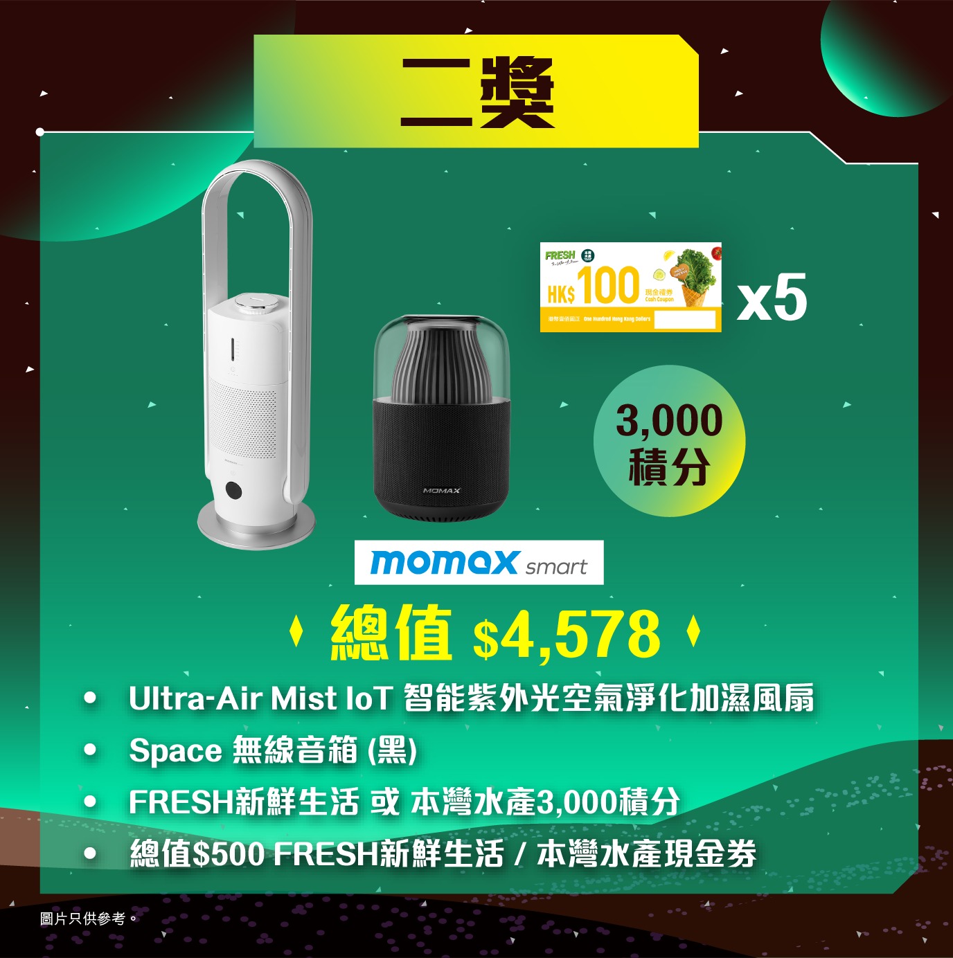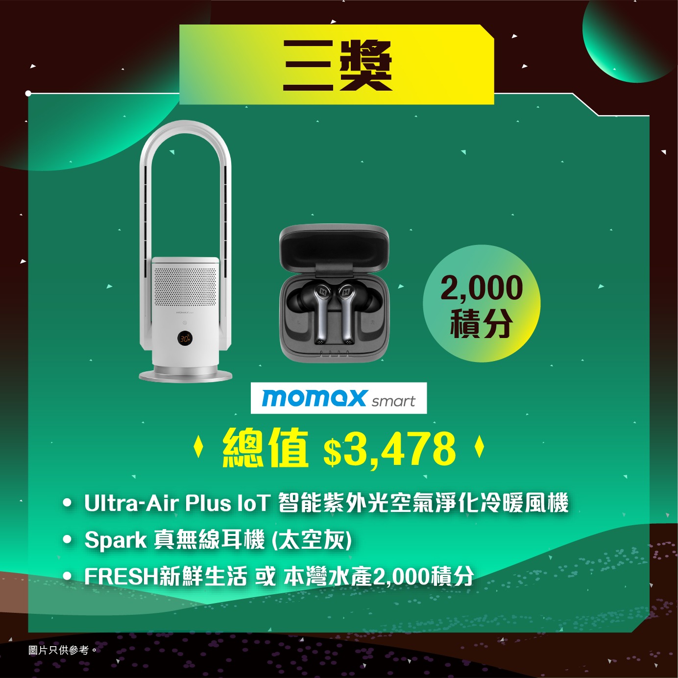 智能家電大抽獎設有終極大獎、二獎及三獎,獎品包括 Ultra-Air Mist IoT 智能紫外光空氣淨化加濕風扇、Smart D Trio-Cleanse IoT 智能紫外光掃拖機械人、Spark 真無線耳機,及 FRESH 新鮮生活超市現金券等,共有1830個得獎名額。只需下載手機 App 即可以免費登記成為會員,享多項會員禮遇。