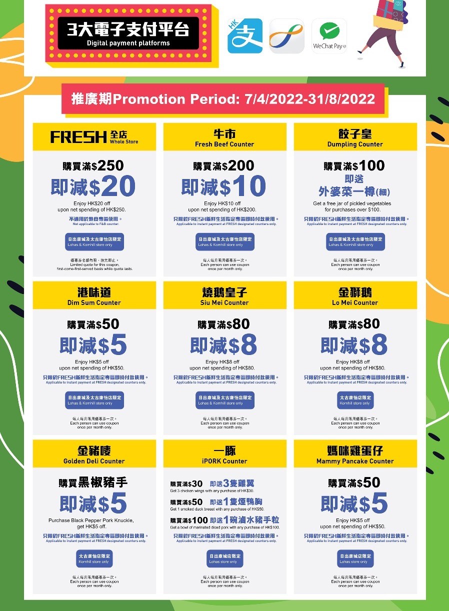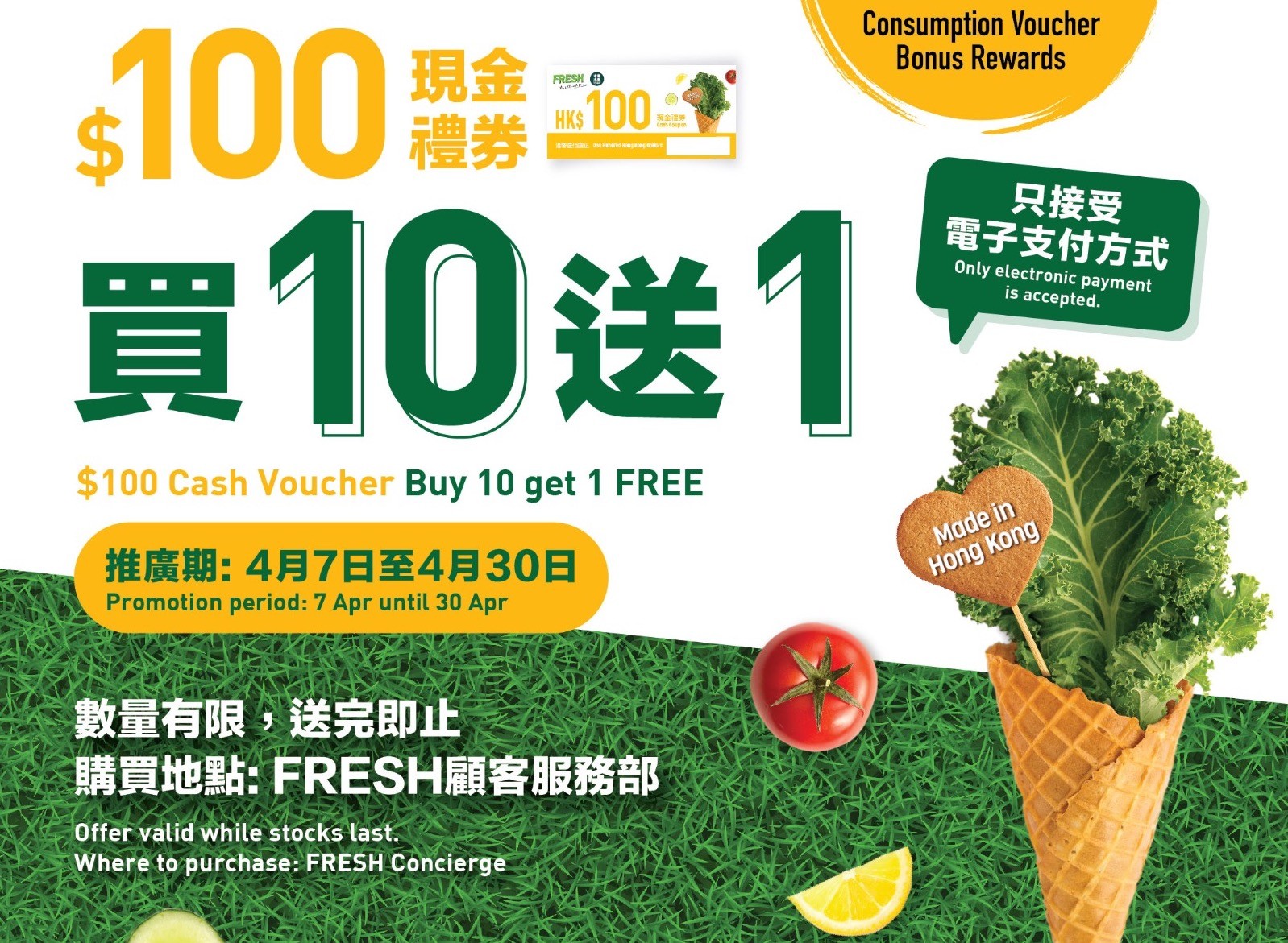 此外,超市亦推出多項優惠, 即日起至4月30日,購買HK$100現金禮券,可享買10送1優惠。超市並於三大電子支付平台發放最高HK$800的電子優惠券,消費者可盡情入貨。 (記者:Janice)