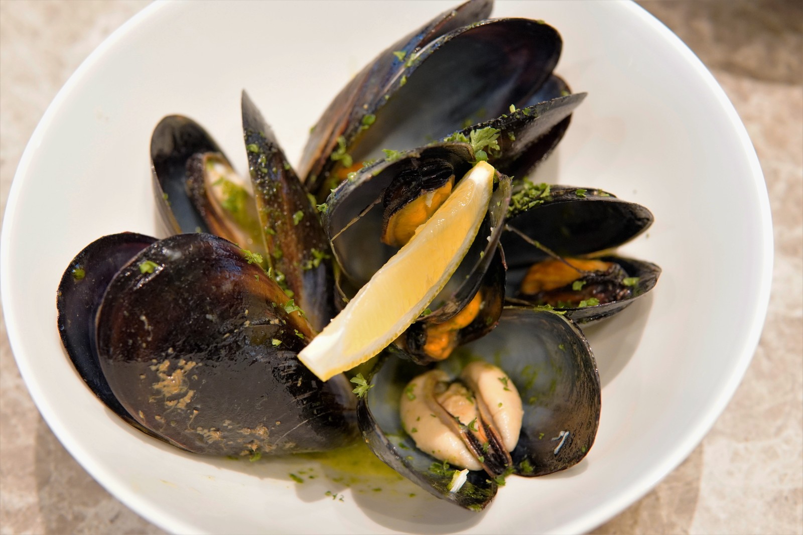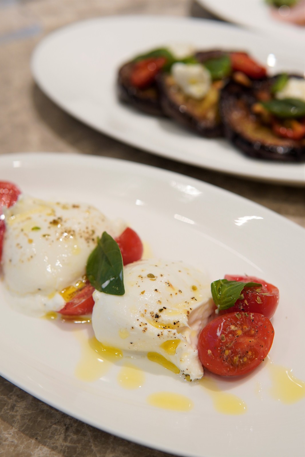 在享用開胃頭盤時,餐廳端上一系列海鮮及意式美食,先上的海鮮拼盤包括每人兩隻生蠔、意大利小龍蝦及魚子醬,產自法國的生蠔入口爽滑充滿海水味,屬濃味的品種,配合同屬重口味的意大利菜,加上魚子醬同吃,餘韻頗長。而意大利小龍蝦肉質肥厚鮮甜,彈牙的蝦肉讓人十分滿足。意式美食包括牛仔柳配吞拿魚醬及陳醋、自製醃茄子配芝士及番茄,布袋芝士配番茄及特級初榨橄欖油等,其中布袋芝士配番茄及特級初榨橄欖油看似簡單,外層煙韌內裏軟滑的芝士配合清爽番茄,清新而不膩。這時再來一道熱開胃菜番茜香蒜煮青口,以肥美鮮甜的青口刺激食客味蕾,頓時胃口大開。