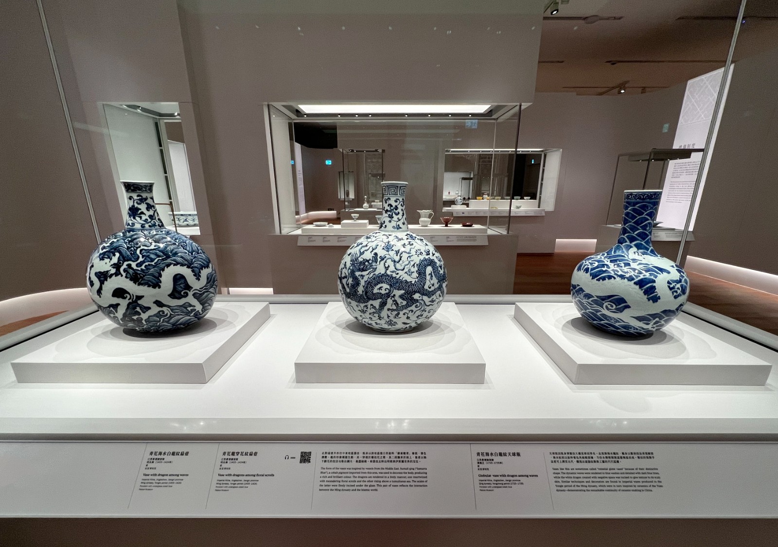同樣在「故宮博物院珍藏陶瓷」展廳中,三支器型龐大的扁壺及天球瓶亦尤為矚目。15世紀,在明代永樂、宣德年間,鄭和進行了七場大規模遠洋航海,跨越了亞洲及東非各地三十多個國家,取得了偉大的歷史成就。而當他重返中華,為帝王帶回來的各式各樣的奇珍異寶、奇聞軼事,當中包括一種符合中式傳統美學中「天圓地方」之說的器具造型——天球瓶。「天圓地方」體現了中國古人的時空觀念,並隱喻「天人合一」的自然和諧規律。根據史學家的推測,天球瓶或源自中東地區伊斯蘭教的銅器,傳入中國之後,因其腹部圓鼓、造型大方,被賦予「蒼穹」的寓意,因此得名「天球瓶」或「千秋瓶」,象徵?「千秋太平」的吉祥寓意,因此自創燒之初就深得帝王的喜愛。到了18世紀,天球瓶的造型亦發生了些微變化,作品從比例上頸部更為修長。下圖中最右的「清雍正青花海水白龍紋天球瓶」,與左方兩件明永樂作品有明顯的對比。筆者更屬意最左側的「明永樂青花海水白龍紋扁壺」,造型古樸,且青花反白的配色亦較特別。