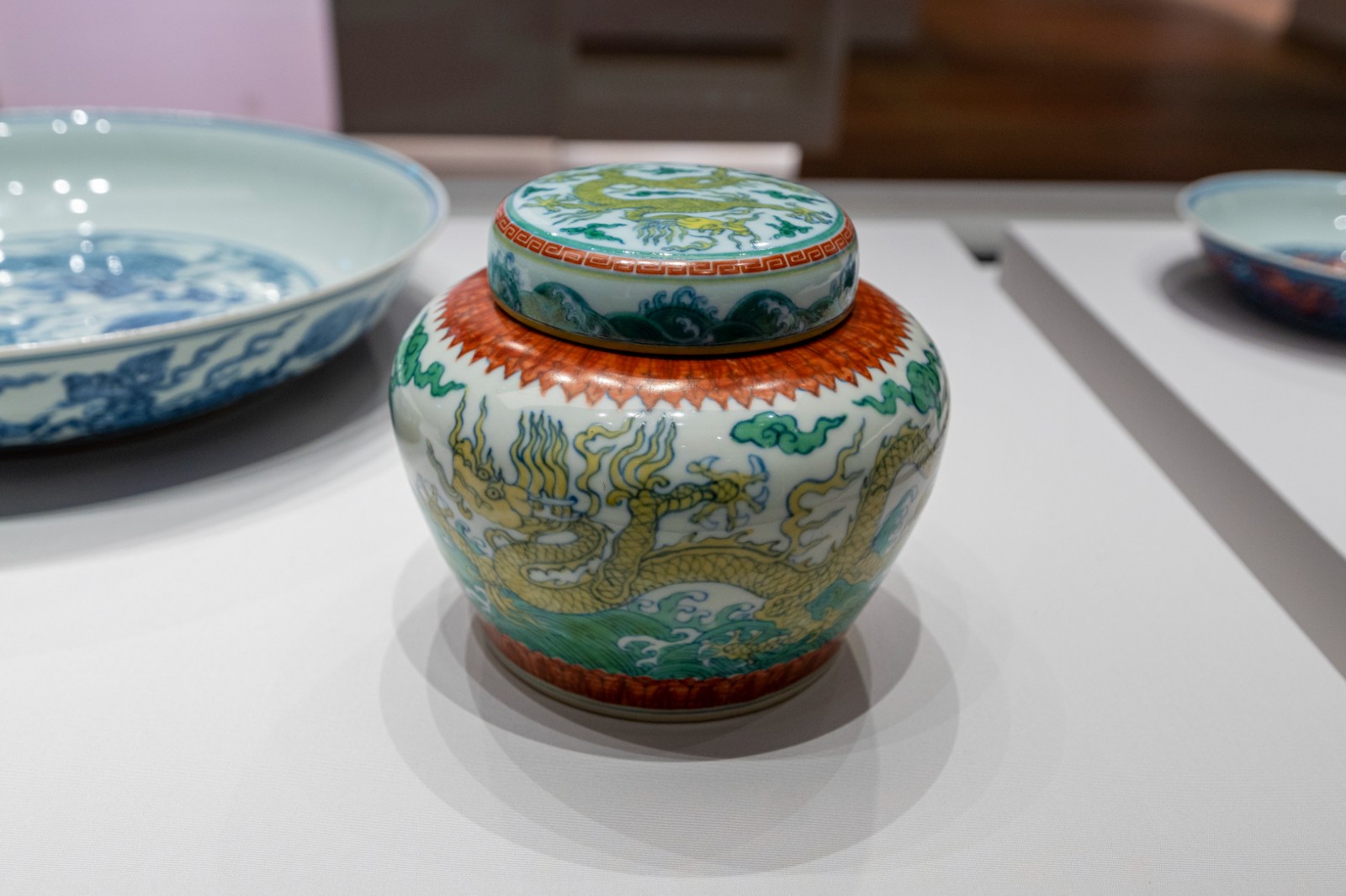若讓筆者在香港故宮中挑選一件「心水」藏品,必然屬「凝土為器——故宮博物院珍藏陶瓷」的「明成化鬥彩海水雲龍紋蓋罐」,底書無邊無框「天」字款。成化時期是瓷器發展的鼎盛時期,國家財富的積累和國泰民安的環境為成化瓷營造了良好的條件,且因成化帝極其寵愛的萬貴妃喜愛瓷器玩物等「奇巧之物」,讓他願意耗費大量國力打造精美的瓷器。展出的這件天字罐亦有「天子罐」之稱。因古代採用《千字文》的文字順序來編排次序,其開篇就是「天地玄黃,宇宙洪荒」,「天」代表第一號,所以天字罐代表成化鬥彩中的極品,小巧玲瓏卻製作精良,即使在拔萃出類的成化瓷中亦屬頂尖佼佼者。成化天字罐存世不足20件,多為博物館藏品,市面流通極少。2000年倫敦蘇富比曾拍出一件天字罐殘器,頸部磨平且缺蓋,在競拍短短七分鐘內,以底價幾萬元到千萬元人民幣成交,可想而知一件完整無損的天字罐將拍得何等高價。