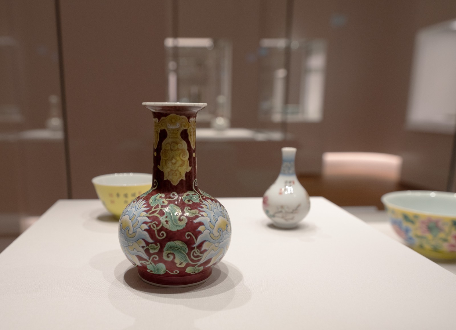 展覽呈現各式清御窯廠琺瑯彩小器,包括琺瑯彩的早期成品「清康熙胭脂紫地琺瑯彩折技蓮紋瓶」。