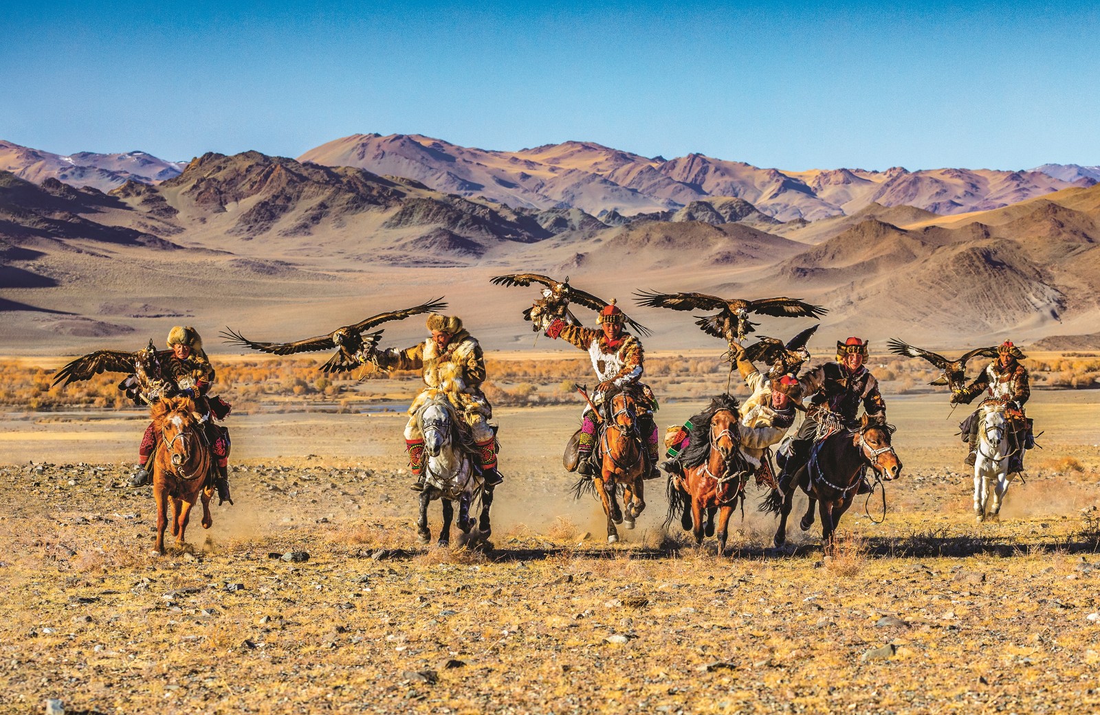 鏡頭下的蒙古國金鷹節,獵人策馬追逐、呼喊被他們馴化的金鷹,以手中的獵物吸引獵鷹,希望以最快的速度讓金鷹找到獵物,贏得比賽。