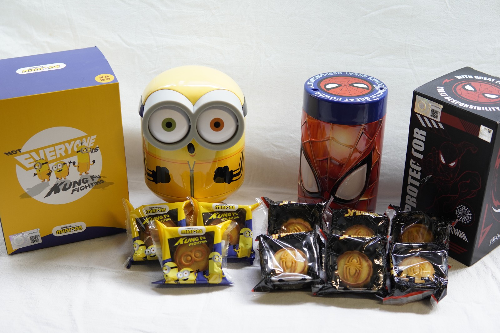 「漫威蜘蛛俠」拔絲蓮蓉月餅,特價HK$188/盒(一盒6個)。「迷你兵團」拔絲蓮蓉月餅,特價HK$168/盒(一盒3個)。