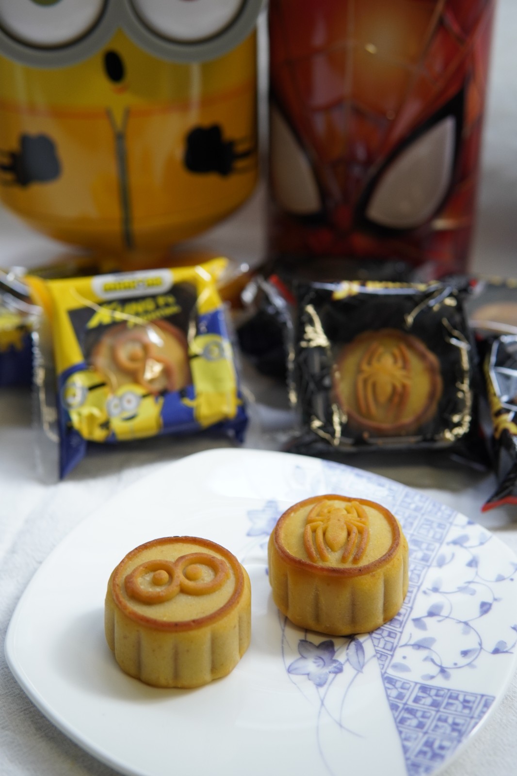卡通禮盒的月餅最受大小朋友歡迎,美心推出的Minions迷你兵團 「迷你兵Bob」和Marvel超級英雄「漫威蜘蛛俠」禮盒月餅就兼具實用性及可玩性。「迷你兵Bob」的造型圓滾滾,輕碰恍如不倒翁般搖來搖去,鬼馬可愛;「漫威蜘蛛俠」則在圓柱禮罐上印有蜘蛛俠造型,罐蓋設有可投射蜘蛛俠頭像的燈,兩款禮盒吃完後均可作玩具或收納盒。兩款月餅均為「拔絲蓮蓉月餅」,分別印有迷你兵的眼睛和蜘蛛俠記號,月餅加入邪惡的「拔絲」效果,能輕易拉出一條條幼滑的鹹蛋黃絲,將清香蓮蓉和焦香的花生茸結合,月餅帶有濃濃蛋黃香。