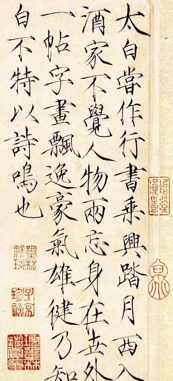 在宋代,李白的字還能多找出幾幅。據北宋的《墨莊漫録》記載,潤州蘇氏家就收藏了李白的《天馬歌》真跡。宋徽宗也收藏了李白的兩幅行書作品《太華峰》、《乘興帖》,還有三幅草書作品《歲時文》、《詠酒詩》、《醉中帖》。書畫收藏講究「流轉有序」,《宣和書譜》確有記載,《乘興帖》在南宋到了丞相賈似道手裏,後來就消失在歷史的塵煙中了。
