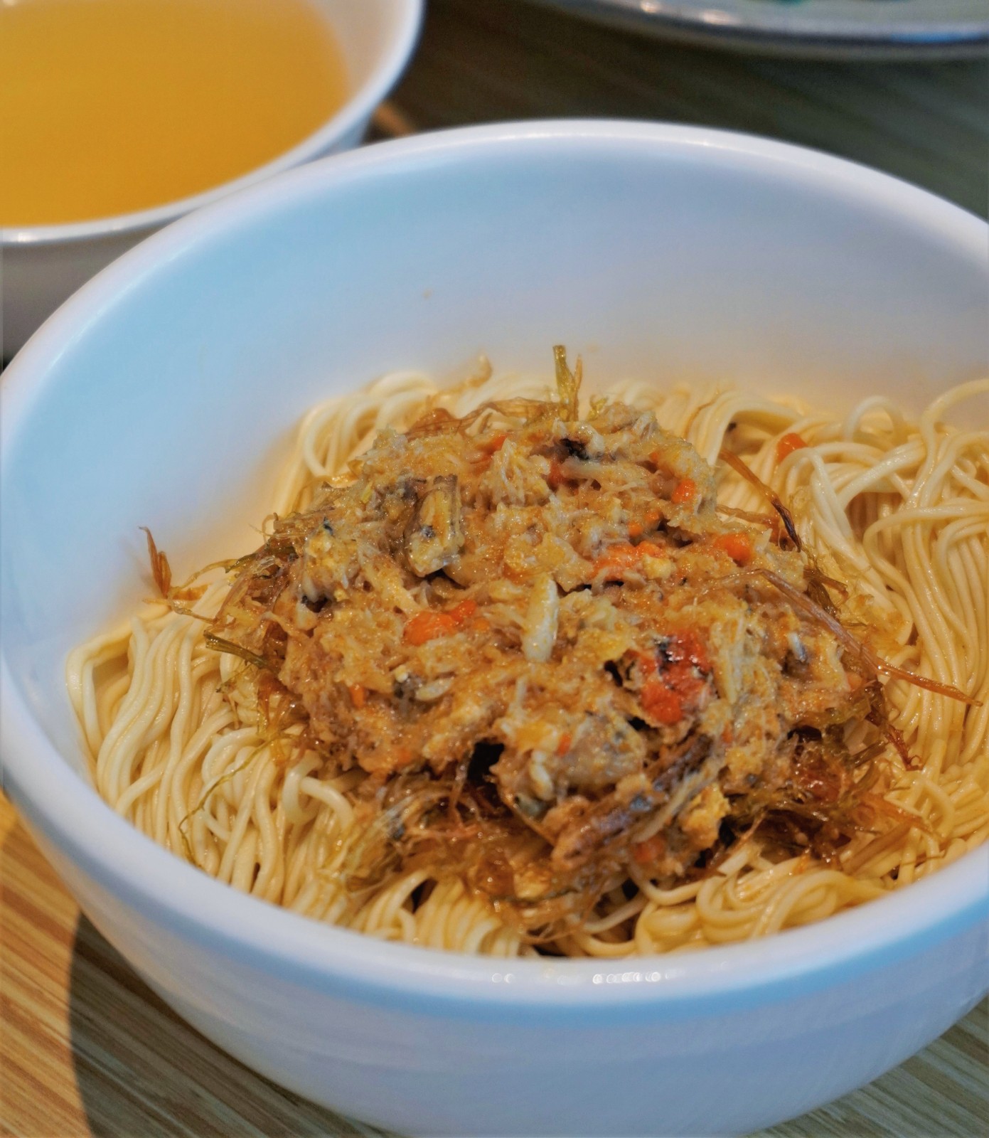 蟹粉拌蔥油毛細麵,HK $108。毛細麵是拉麵師父現場即叫即拉,口感香滑。
