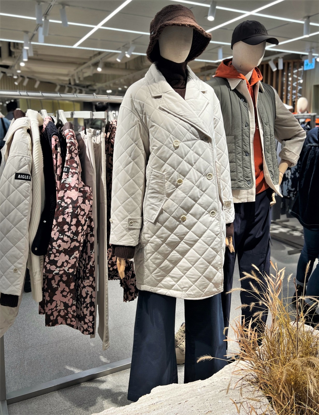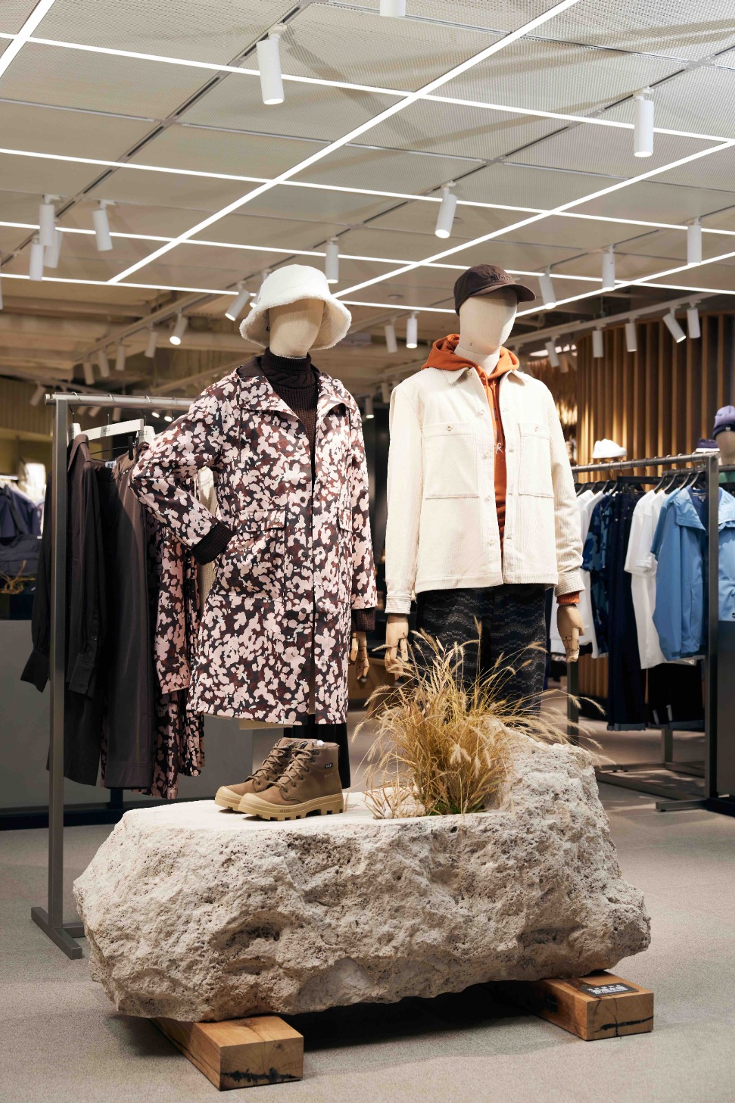 店舖亦與本地植物裝置品牌QUESTterrarium合作,依照季節變換設計不同的保鮮植物裝置,如本月以具濃濃秋意的芒草作為主角,配合今個秋冬「FALL SENSATIONS」系列推出。此系列主題圍繞遊牧精神,以各種民族圖案印花和刺繡作為設計主軸,突顯對工藝的重視。參照稻穗金黃的意象,採用大地色調,配以精緻紋理圖案,將兩者結合,表達出遊牧民族自由自在的文化。主打的各款印花圖案包括大地色樹紋圖案、粉色花卉圖案和紅色樹葉圖案等,款式包括男裝混羊毛西裝長外套、男裝松樹綠色再生纖維GORE-TEX防水長外套、女裝Dupont Sorona 再生纖維格紋長外套等。遊牧精神強調與大自然相互融合,配合店內天花板上的一片金黃芒草,加上各角的秋草裝飾,恍如置身郊外,連試衣服都格外有氛圍感。 (記者:Janice)