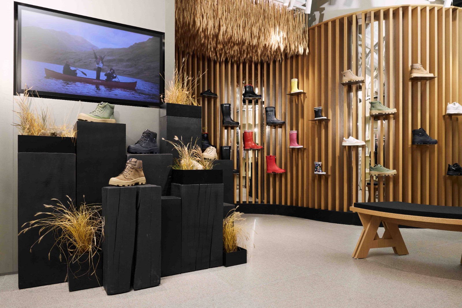 新店裝潢設計簡約俐落,將「大地」、「城市」和「大自然」元素融合,以大地暖色系為主,採用不鏽鋼、原木及其他可再生材料作配襯,表達出都市與大自然的意象對比。最注目是與環保創作品牌QUESTterrarium 、香港木庫 、OOObjec合作的藝術裝置,包括使用由香港本地回收的木材設計店內多個重點環保陳列裝置、將回收布料加工製成組合的展示衣櫃等。店內還有以本地回收木製成的橡膠樹藝術裝置,放置了模擬收集天然乳膠的過程,裝置延伸至擺放了不同的橡膠靴和鞋履的木條牆上,讓客人了製作天然橡膠鞋履與大自然密切的連繫。配上保鮮植物,播放的放鬆音樂、雨聲和戶外音效,從細節營造出大自然的氣息,強調「逃離城市,與大自然連繫」的新店概念。