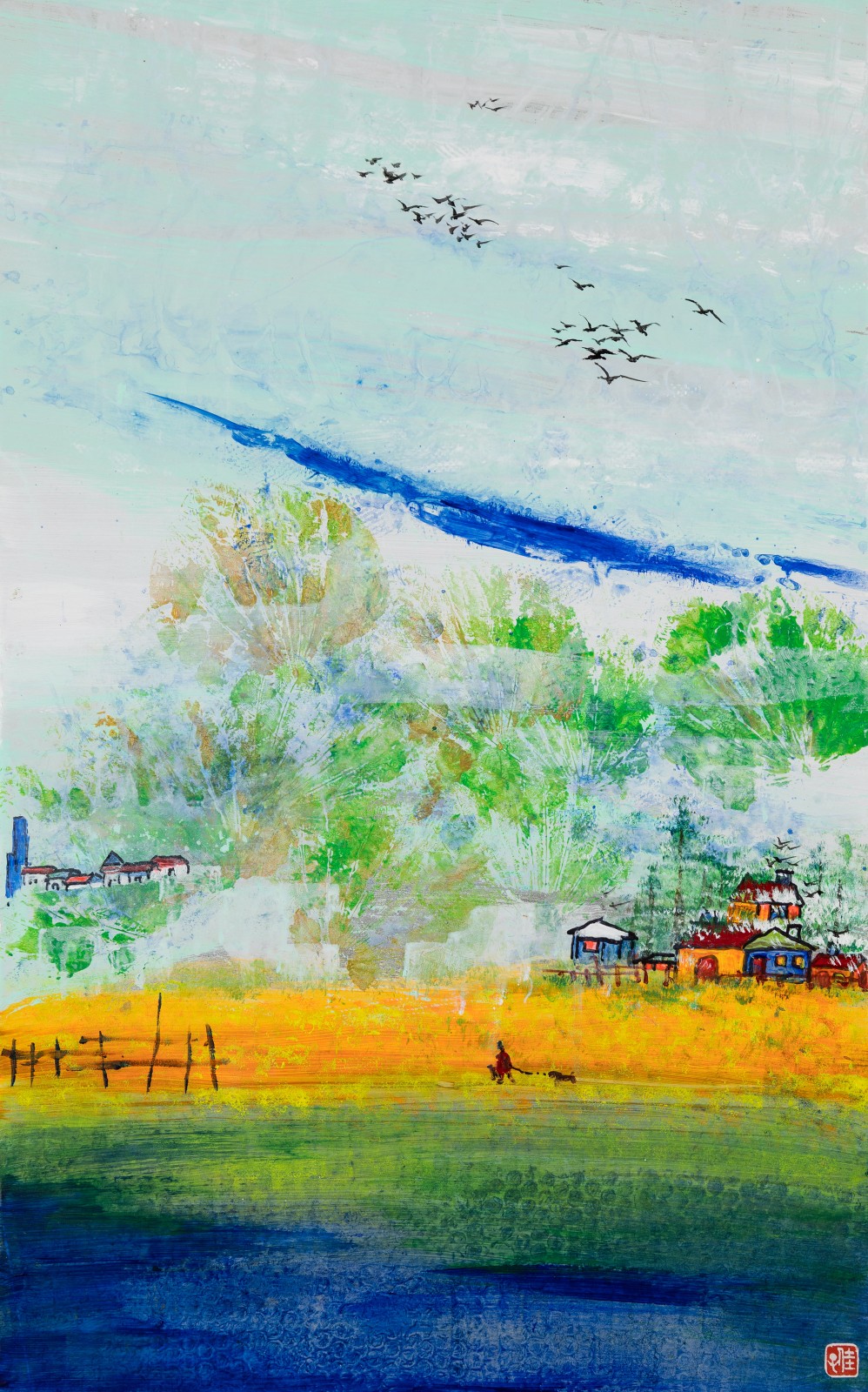 陳佳的作品中流露出率真的自由,她的畫作如同詩歌一般飽含情感。她用顏料渲染出生活的色彩,表達對人生的思考與感悟。生活像是一場波瀾壯闊的旅行,喜怒哀樂是旅途中的繽紛色彩,她遵循本心,從身邊的點滴中尋找藝術的色彩。如果說四季是人生的旅途中循環往復的風景,那麼家就是心靈歷經跋涉之後的港灣。陳佳在《家》中用明媚的色彩抒寫了對家鄉的眷戀。金黃的稻田中出現幾間彩色的房屋,湖面上倒映着青翠的樹林,群鳥從蔚藍的天空中飛過,人與自然和諧相伴,彷彿陶淵明詩中「採菊東籬下,悠然見南山」的田園生活。