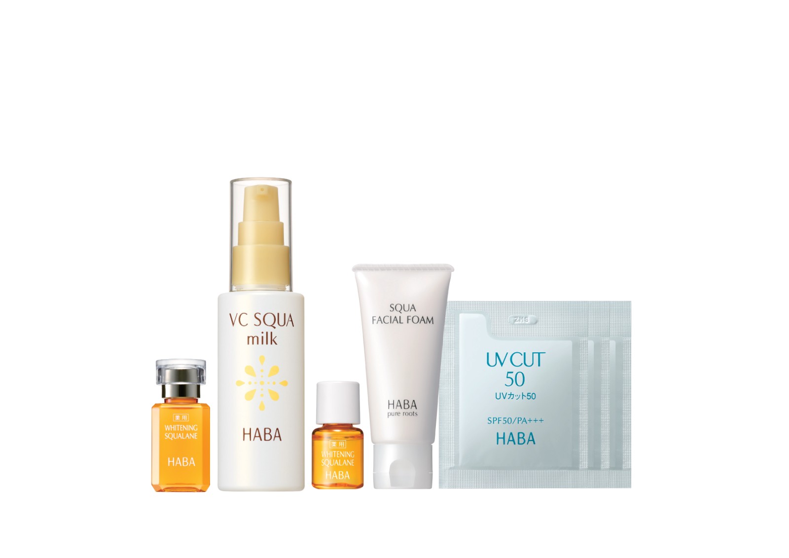 雪白美肌亮澤組合,HK$428(價值HK$885)。包括鯊烯透白美肌清油 15ml、VC鯊烯乳液 60m、鯊烯透白美肌清油 4ml、鯊烯潔面泡沫 30g、鯊烯透白美肌清油 4ml、美白防護乳SPF50/PA+++ 3g x 3pcs。