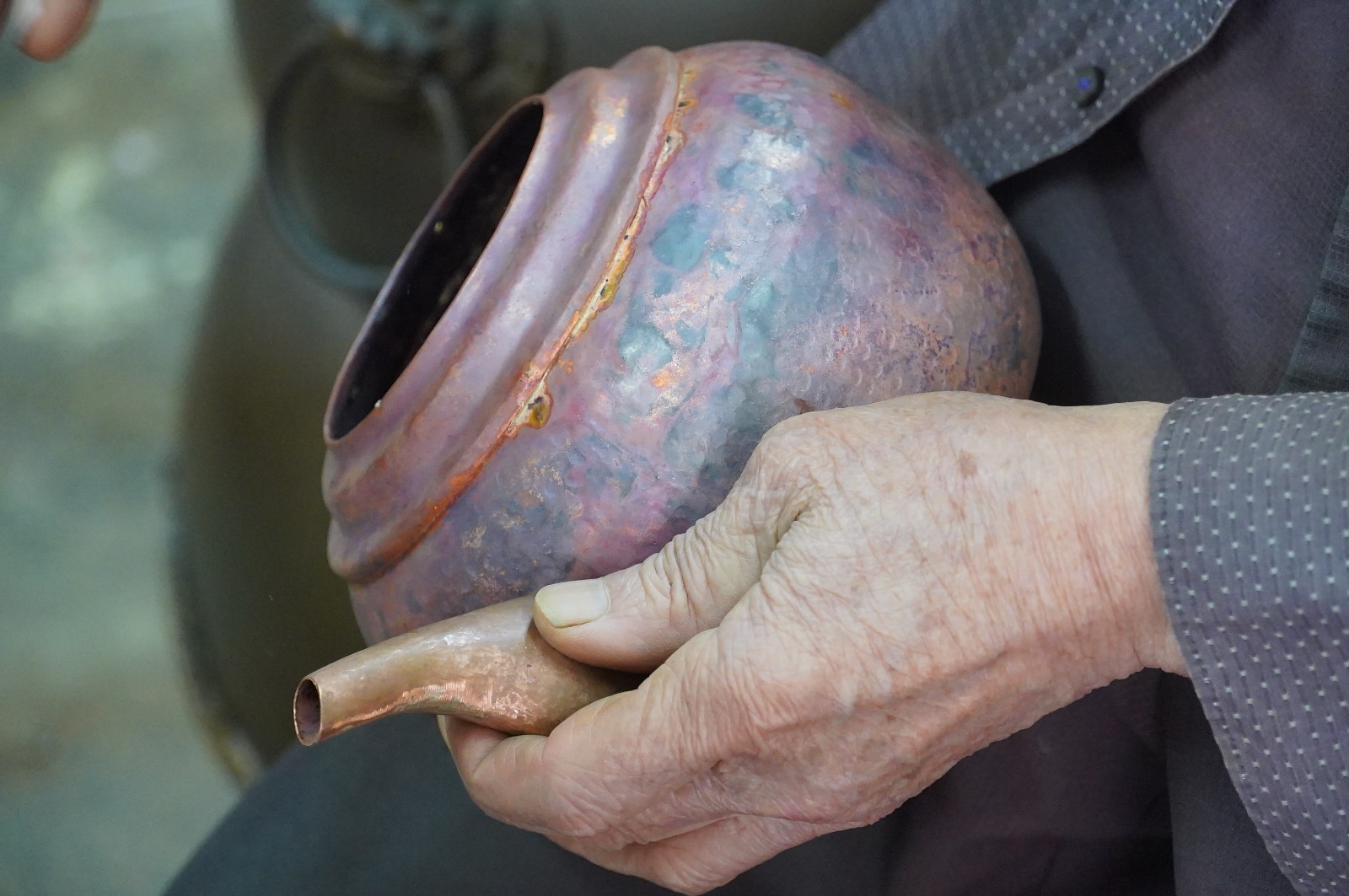 兩位白髮蒼蒼的八旬師傅,是對親兄弟。哥哥陸樹才坐在店外利用日光照明,燒製焊接銅器,弟弟陸強才弓身坐在店內拿着鐵錘打銅,「噹噹噹……」記者在街外已可聽見響亮的敲打聲。