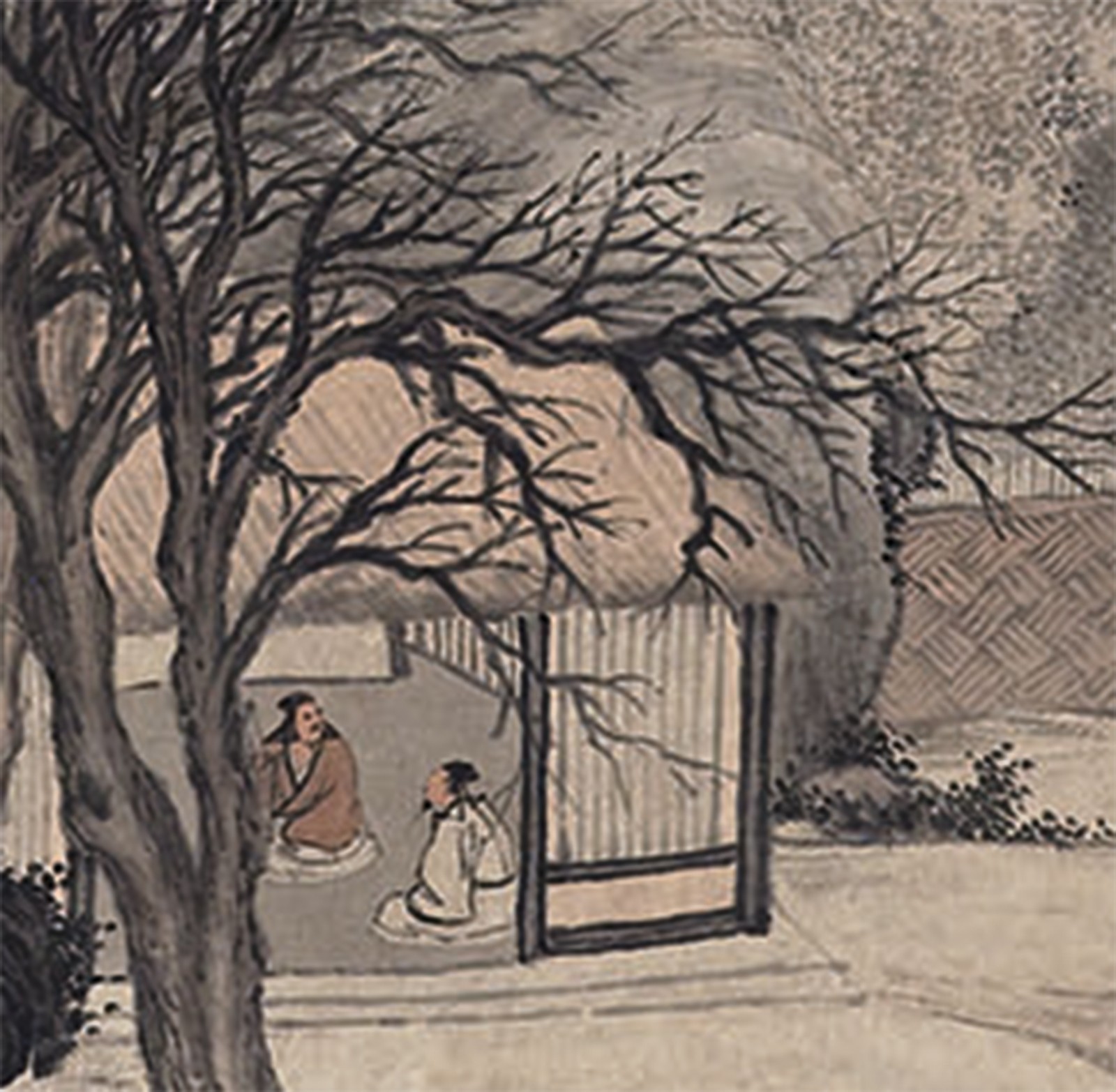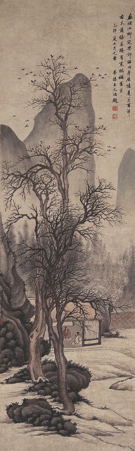 王文治為此畫題詩道:「畫裡江鄉宛樂郊,西田老屋憶蓬茅。百年古木蕭條甚,剩有寒鴉補舊巢。」詩中意境蕭索冷寂,畫家用沉厚的墨色勾畫出古木枯枝,繁而不亂,前後兩棵樹疏密對比自然,於色調上也拉開層次,和遠景形成強烈的虛實對比。樹下磐石形態奇異,並以重墨點出細密的苔點,蒼勁渾厚之餘而不失溫潤。庭前曠野筆墨簡淡,凸顯主體的繁密,盡顯荒疏古寂之氣,與樹梢的寒鴉形成呼應,扣回詩句主題,彰顯出明清文人的詩書畫意趣。