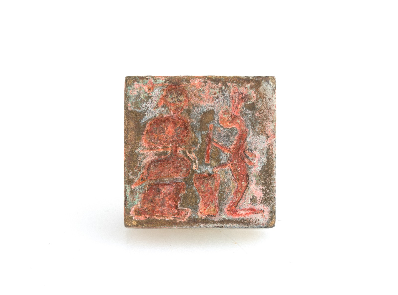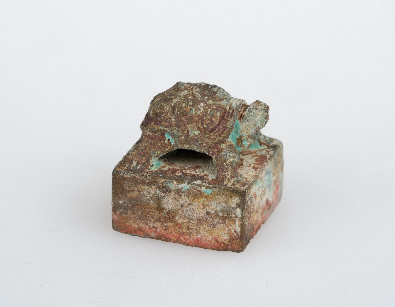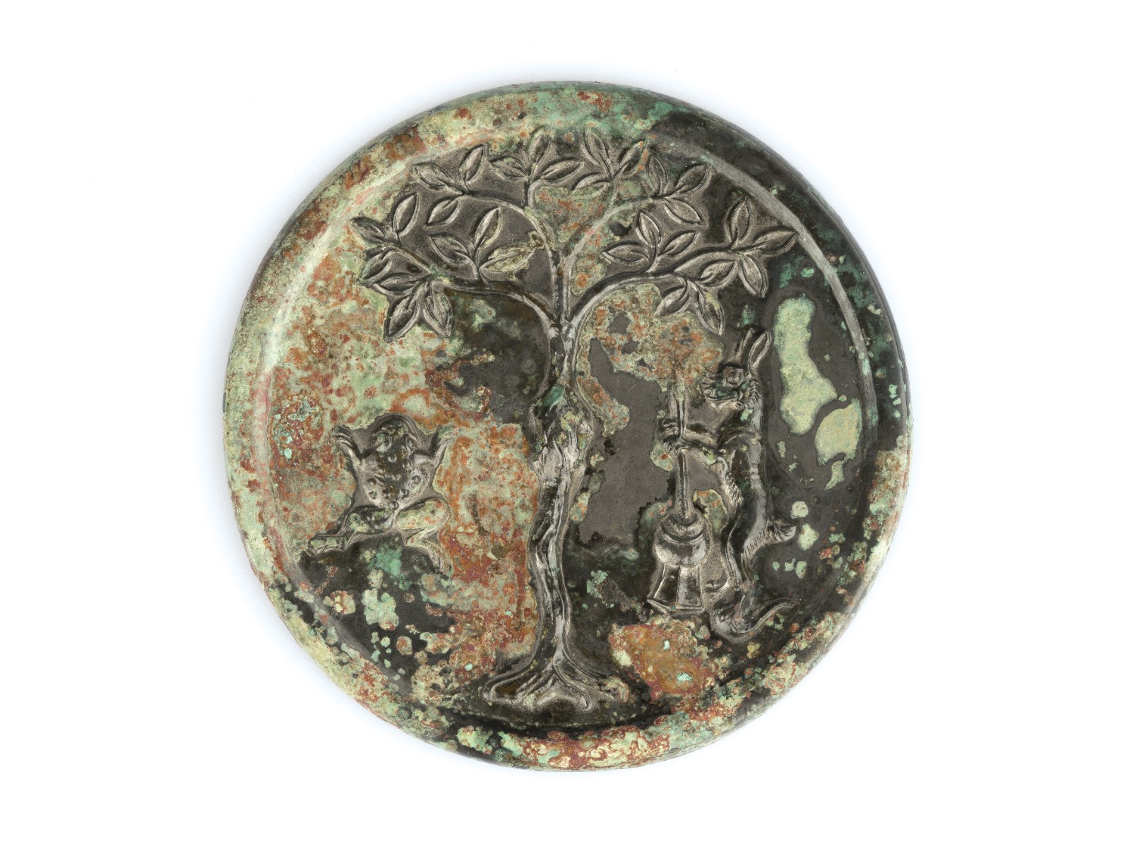 「早在先秦時期,古人相信月與兔之間有關聯,屈原創作的長詩《天問》中就有講及月中有兔。」童宇解釋,在古人眼中兔子或多或少與月亮相關,相信兔子是月亮上的動物,和月亮有緊密關係。其中玉兔搗藥的傳說廣為流傳,象徵了長生不老。展覽中年代最久遠、東漢早期的展品「西王母玉兔搗藥龜鈕銅印」上有玉兔在搗藥,銅印上頭戴髮飾的人形圖案被認為是傳說中的西王母,玉兔正跪坐搗藥,代表長生不老的神仙西王母與搗藥玉兔是常見的配搭。展品「月宮紋銅鏡」則展示玉兔的另一個組合,「唐代流行以『月宮』作紋飾的銅鏡,通常以嫦娥、蟾蜍、搗藥玉兔及桂樹構成『月宮』紋飾,同樣有長生不老的寓意。仔細觀察,鏡上沒有嫦娥,或許是工匠巧思,意指照鏡者即是嫦娥。」