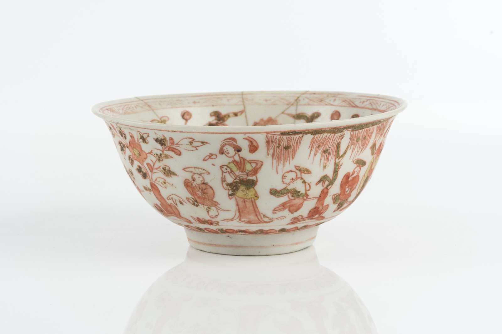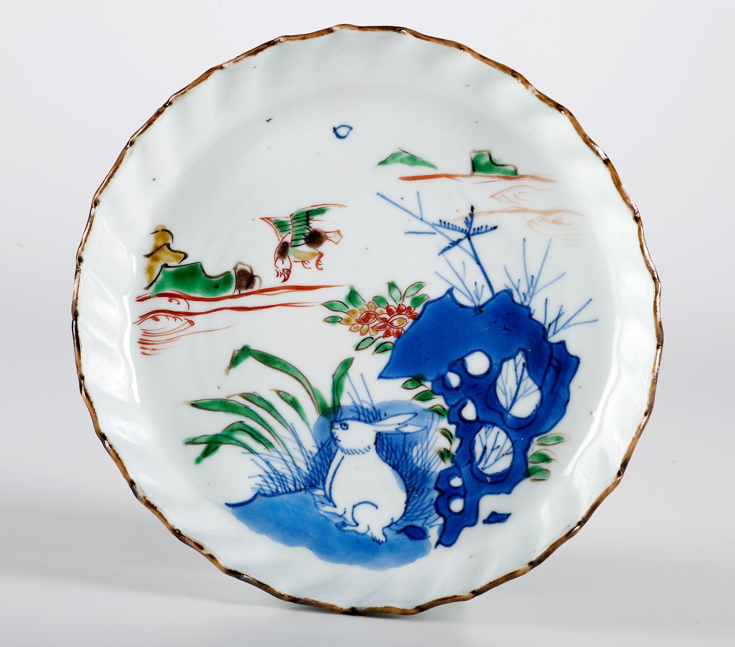 除長生不老的寓意,兔與月的關係緊密,古人認為太陽代表男性,月亮代表女性,加上兔繁衍能力強,也有象徵多子多福之意。展品嘉靖時期的外銷瓷碗「紅綠彩仕女嬰戲紋碗」上,描繪了仕女抱兔的景象,並搭配嬰戲紋,有祝福多子多孫的含義。此外,兔子亦常與雀鳥聯繫在一起。兔子象徵月亮,雀鳥象徵太陽,有日月陰陽相對之意。「青花五彩鷹兔紋盤」描繪經典的鳥兔捕獵情景,只見鷹盤旋回首,恍如要俯身下衝,兔躲避逃跑,十分生動。