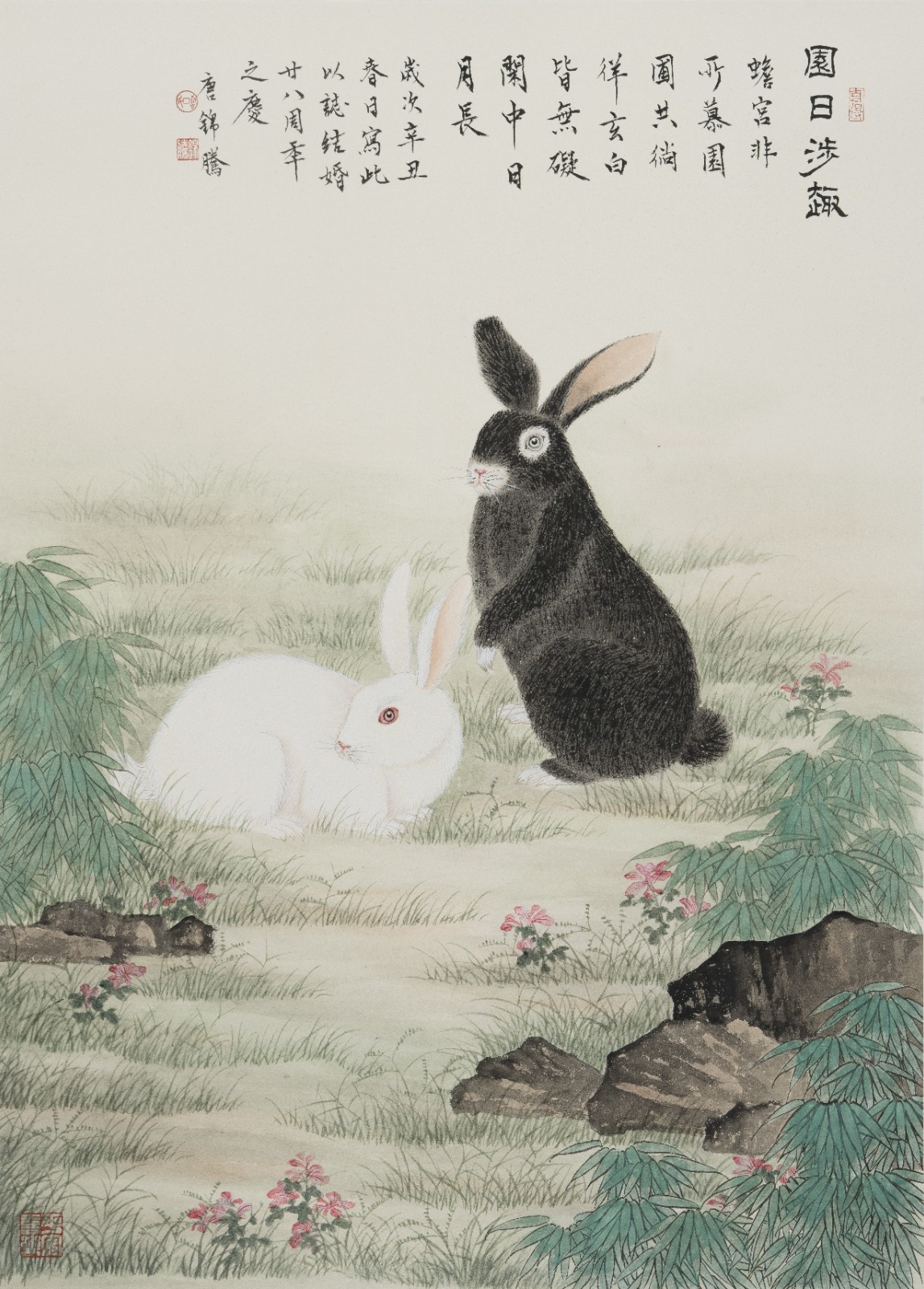 兔子作為古代常見動物,不少畫家將其作為繪畫主題,據童宇介紹,最著名的兔畫要數現藏於台北故宮博物院、北宋畫家崔白的《雙喜圖》,該畫描繪了一隻坐兔回首顧望兩隻鳴噪的喜鵲。宋畫多以工筆為主,強調寓意,風格圓潤喜慶。展品唐錦騰的《園日涉趣》強調宋元時期中國工筆畫風格,造型準確,兼工帶寫,童宇提醒可仔細觀察畫中兔子的毛流:「畫家一筆筆勾勒,凸顯毛茸茸的感覺。一白一黑兩隻兔子,不論眼珠顏色、姿態等均略有不同,由於作品為畫家誌慶結婚周年作品,相信是寄寓性格各異卻能和諧共處之意。」