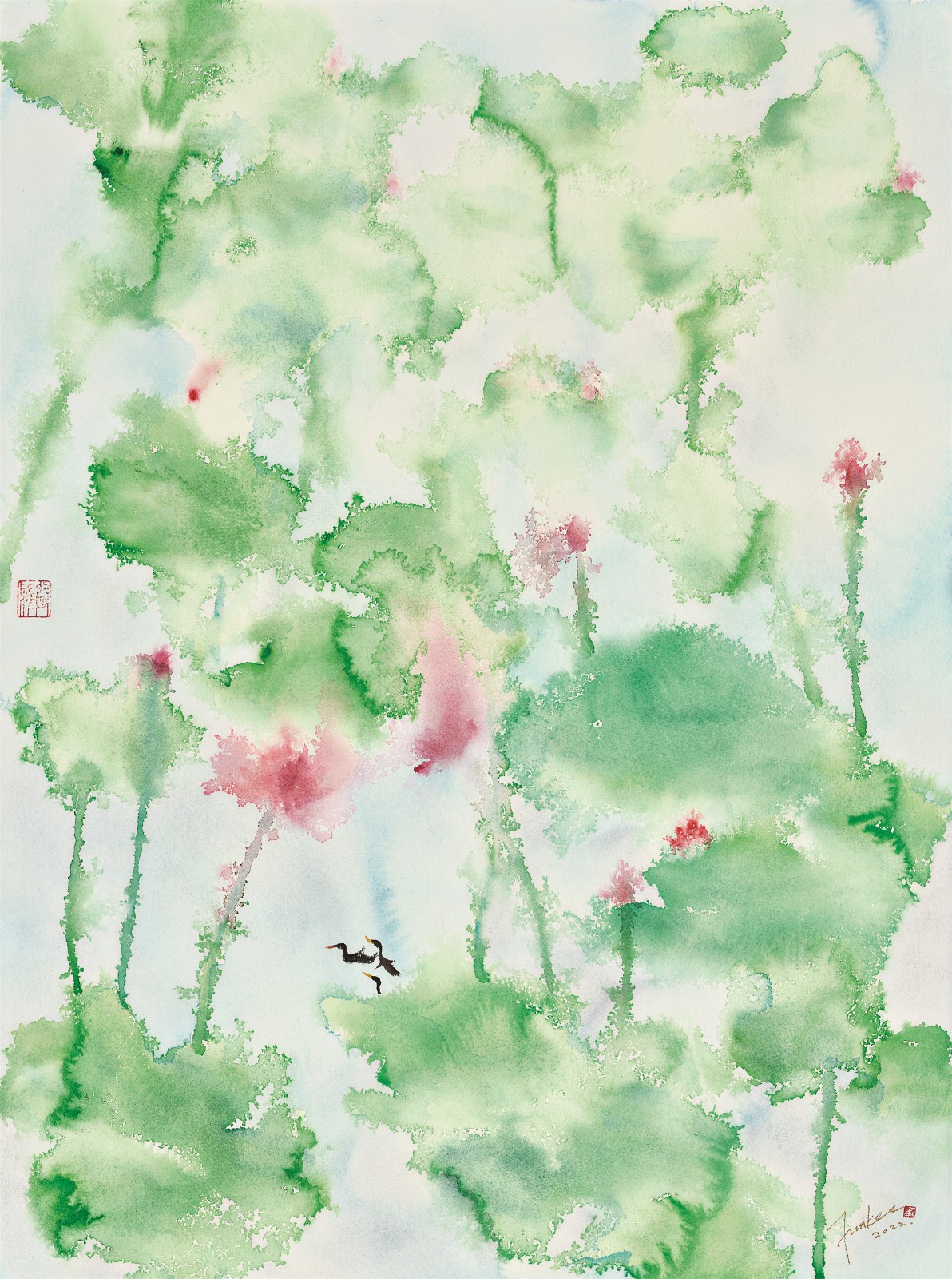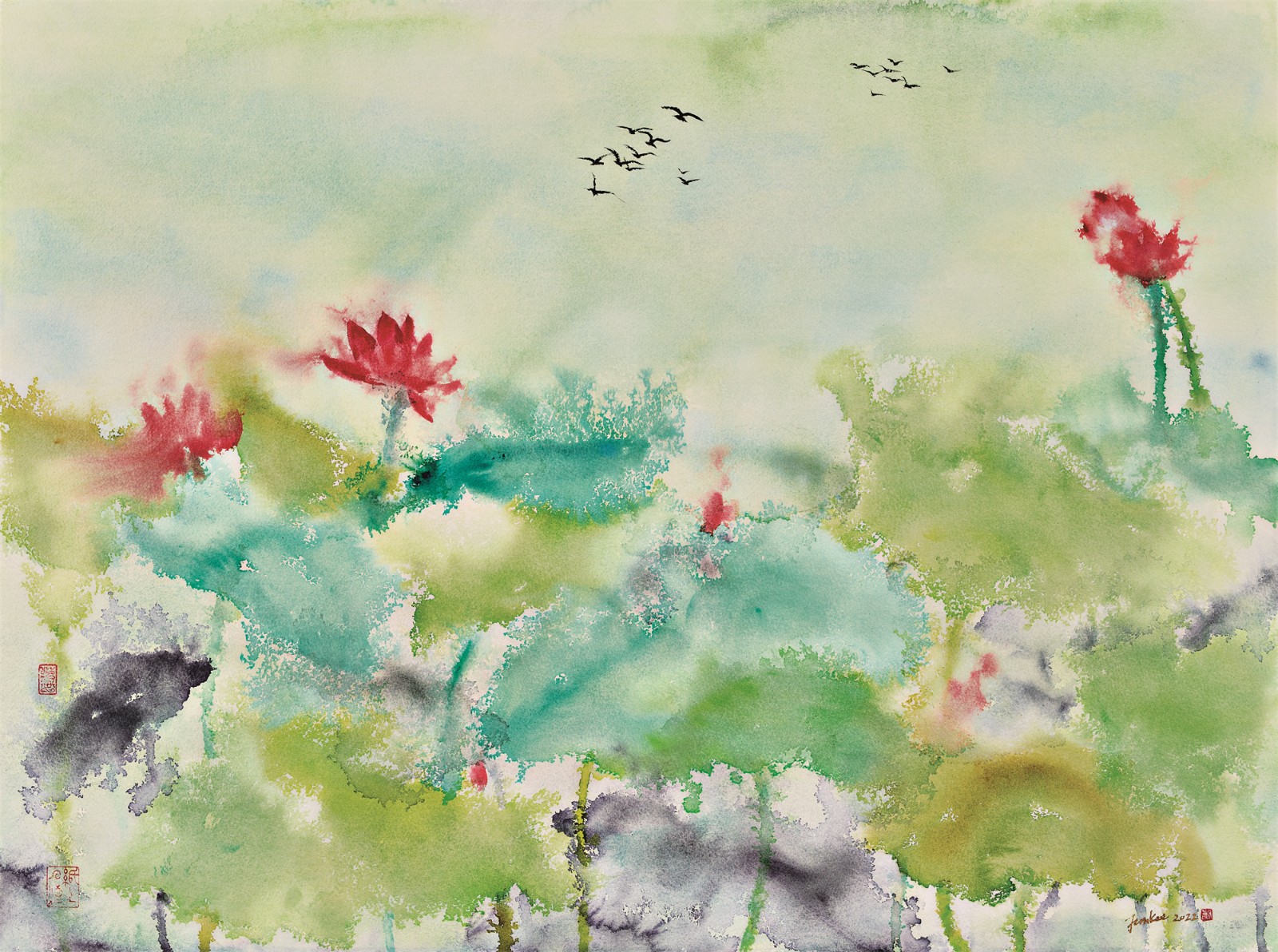 我的荷塘水彩畫「菡萏思柔」系列中可以見到荷花自然天成的靈氣。荷花生長於水中,花水相映更顯柔媚性情。這組作品中用濃淡的色彩表現荷之花、葉、色,配以霞光、綠水,展現出菡萏之美、鮮、豔。每件作品都彷彿籠罩在水霧中,畫面柔美、潤澤、朦朧、含蓄,水彩的特性與荷花的輕柔、池水的流動感完美結合,蘊含着夏日荷塘的清新氣息,冀能呈現出強烈的畫面張力。