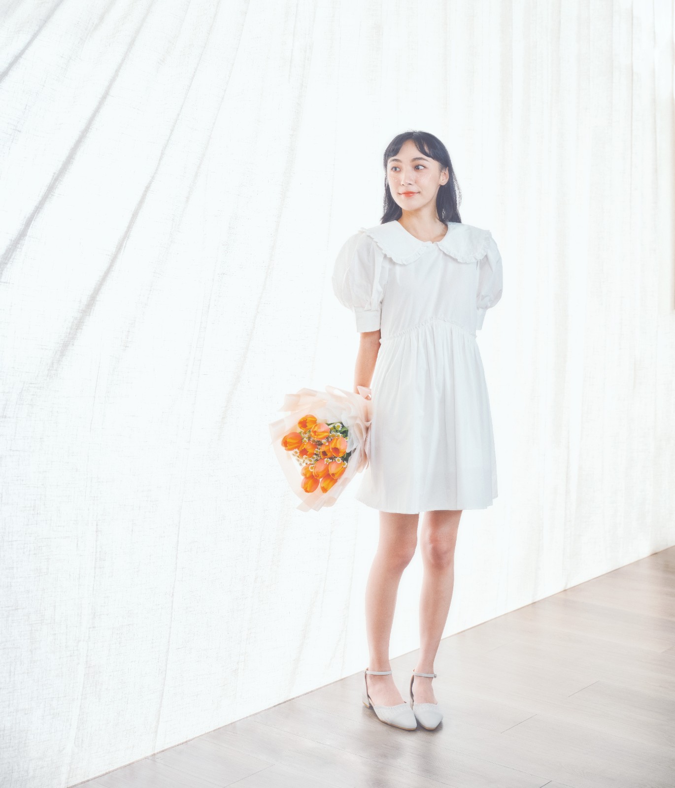 淺灰色平底鞋富質感,跳脫經典的黑白兩色,配上可愛風連身裙塑造甜美的輕熟風格。