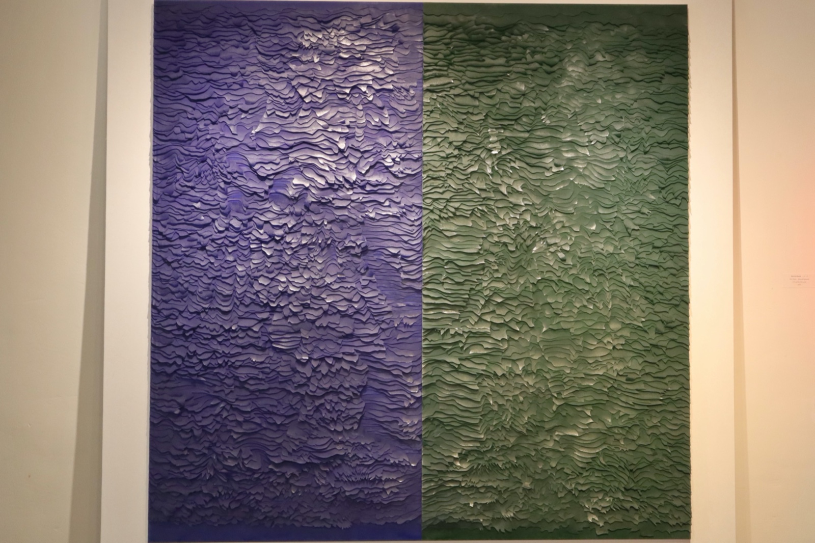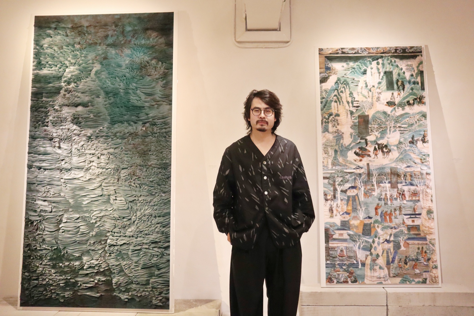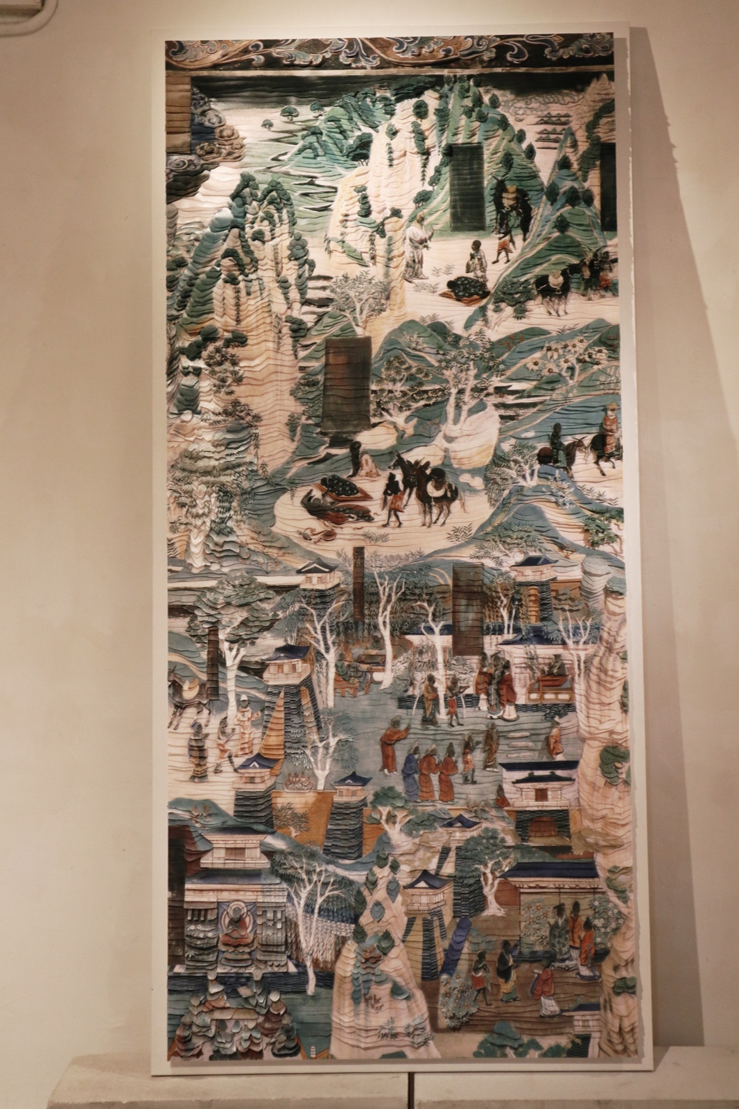 這項藝術不但是對耐性、心性的磨練,工序精密、過程艱辛,紙張材質、空氣濕度等皆影響最後作品的呈現。張氏分享,有一年帶着其龍鱗裝作品遠赴西藏參展,就因當地乾燥的天氣,濕度的變化令作品的紙張翹起。「作為創作者,未考慮到環境因素,是一個失誤的展覽,作為觀者,卻覺得是一次新奇的體驗。」雖然這次展覽不算成功,但他卻因而開啟了另一扇創作的大門,發掘一種全新的創作形式「千頁」。後來將作品送回工作室,翹起的部分仍沒有還原,他拿起剪刀彎彎曲曲地修剪,就此形成更生動、更富力量的畫面。在是次展覽中,能欣賞張曉棟多幅千頁作品,有敦煌壁畫,也有抽象的畫面,層層疊疊的紙被修剪成不同紋路,隨風吹過,畫面如同「活過來」,只有親身觀看,才能感受得到其獨特的意境。 (記者:Janice 攝影:馮瀚文)