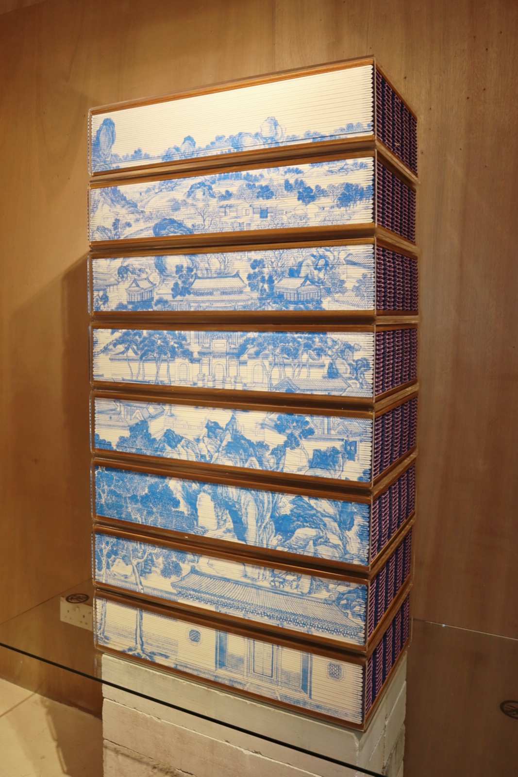 張曉棟除了是藝術家,還有另一身份——「龍鱗裝」的非物質文化遺產傳承人。他創作的書籍難以用語言、文字描述,採用特別裝訂方式的書頁恍如鱗片,圖畫隨着文字若隱若現,最後變成一幅長卷畫,令閱讀變得更有趣味,讓書頁變成當代藝術品。張曉棟在接受本報專訪時表示,自己崇尚「物」,喜歡實體的事物:「最好是面對面溝通,看書也是。」