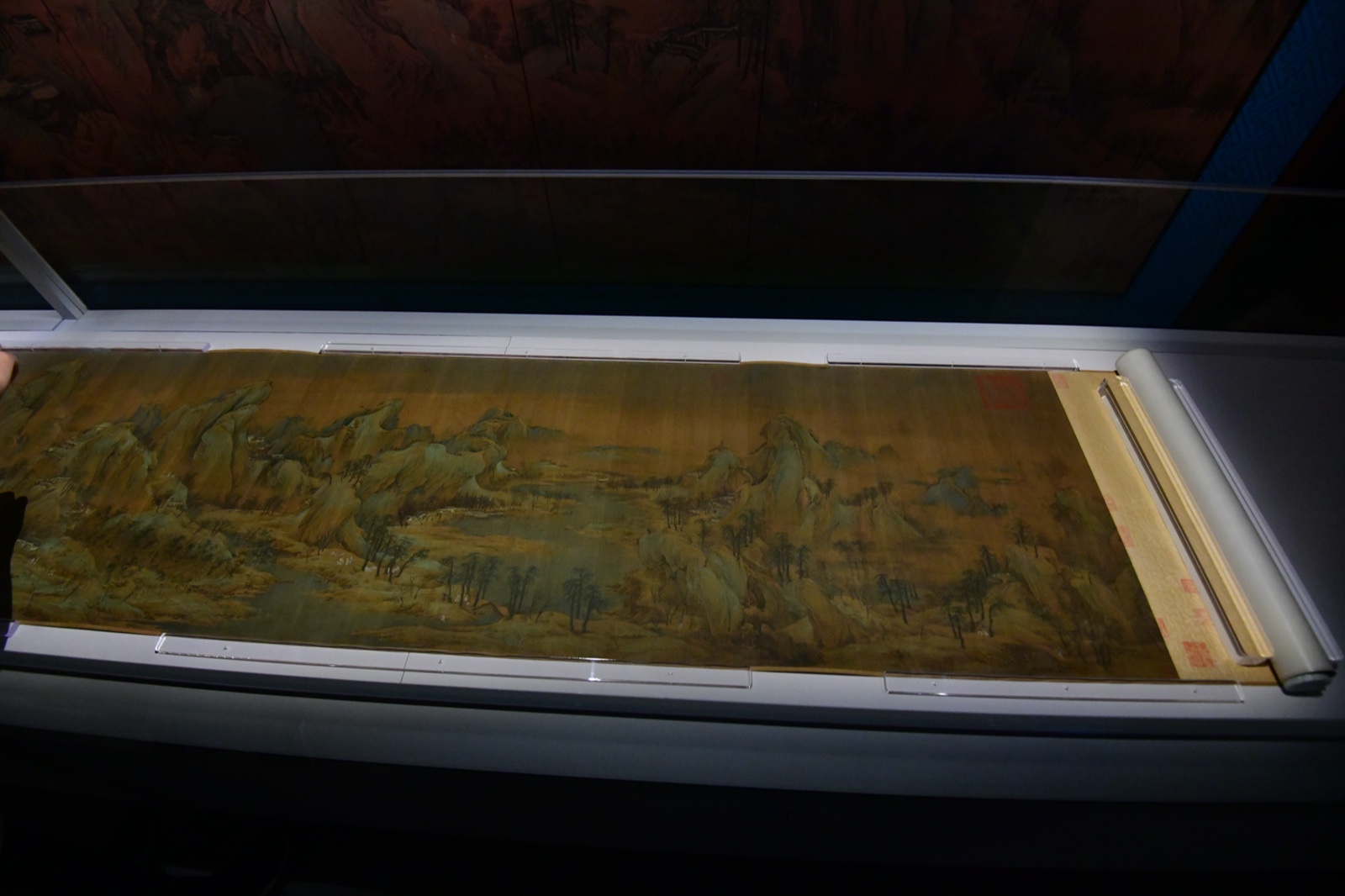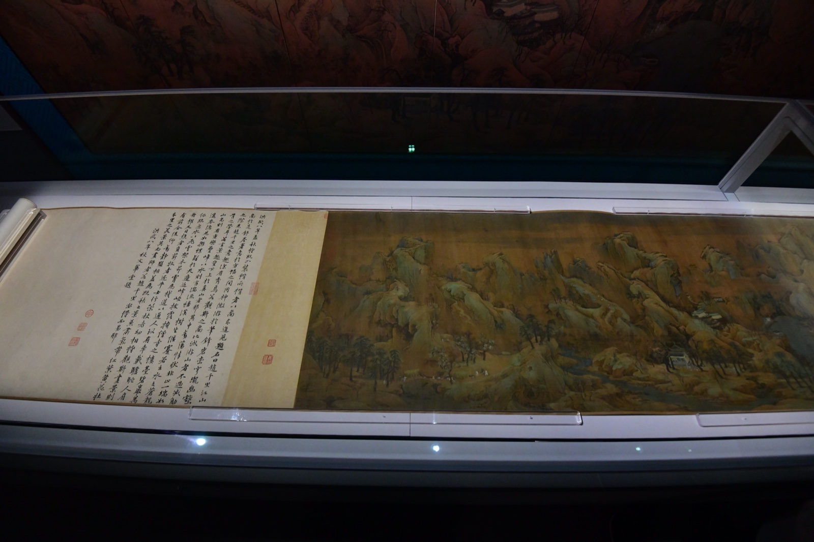 畫卷在布局上用傳統的「散點透視」法,將高遠、平遠和深遠適當地結合起來,造成容量大、布陣奇、開合有度的效果,在多變之中得到一種和諧的整體感。畫中所繪顯然是北方山水,群峰綿密,層巒疊嶂。