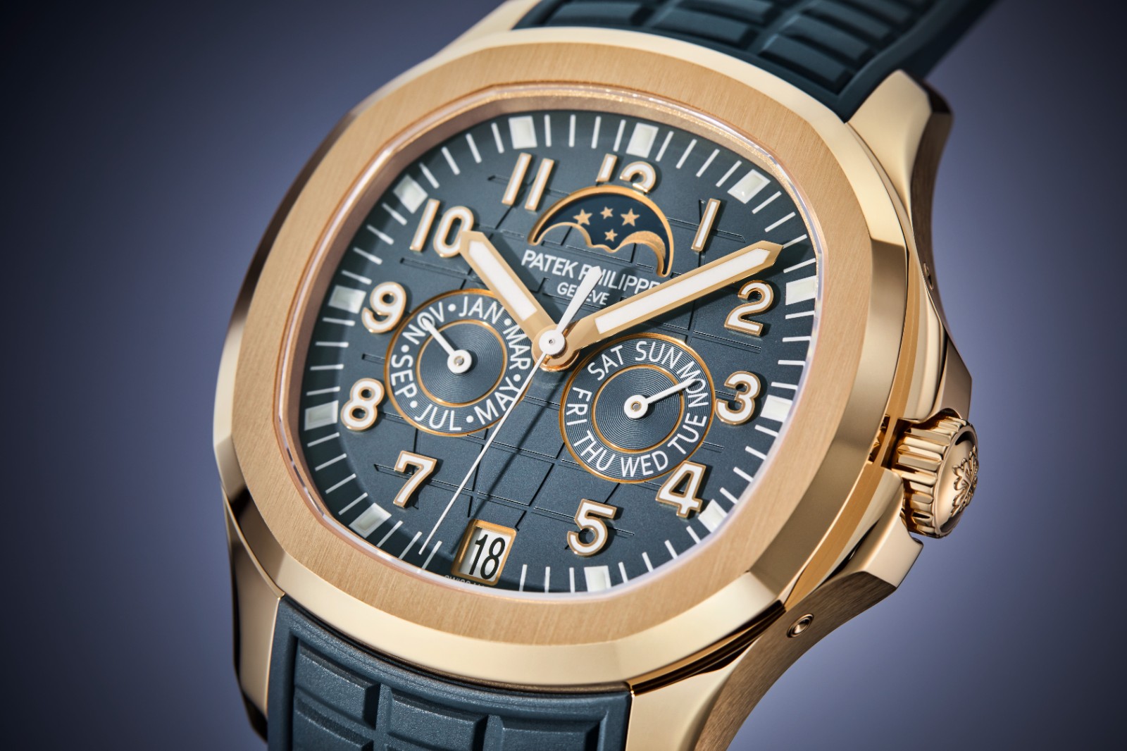 5261R-001玫瑰金腕表,表面與表帶添上藍灰色調,以非寶石鑲嵌腕表姿態,成為品牌複雜功能女裝時計系列的典範之作。