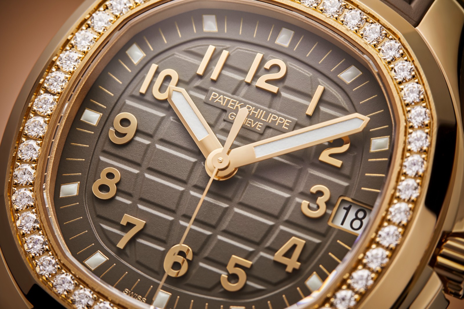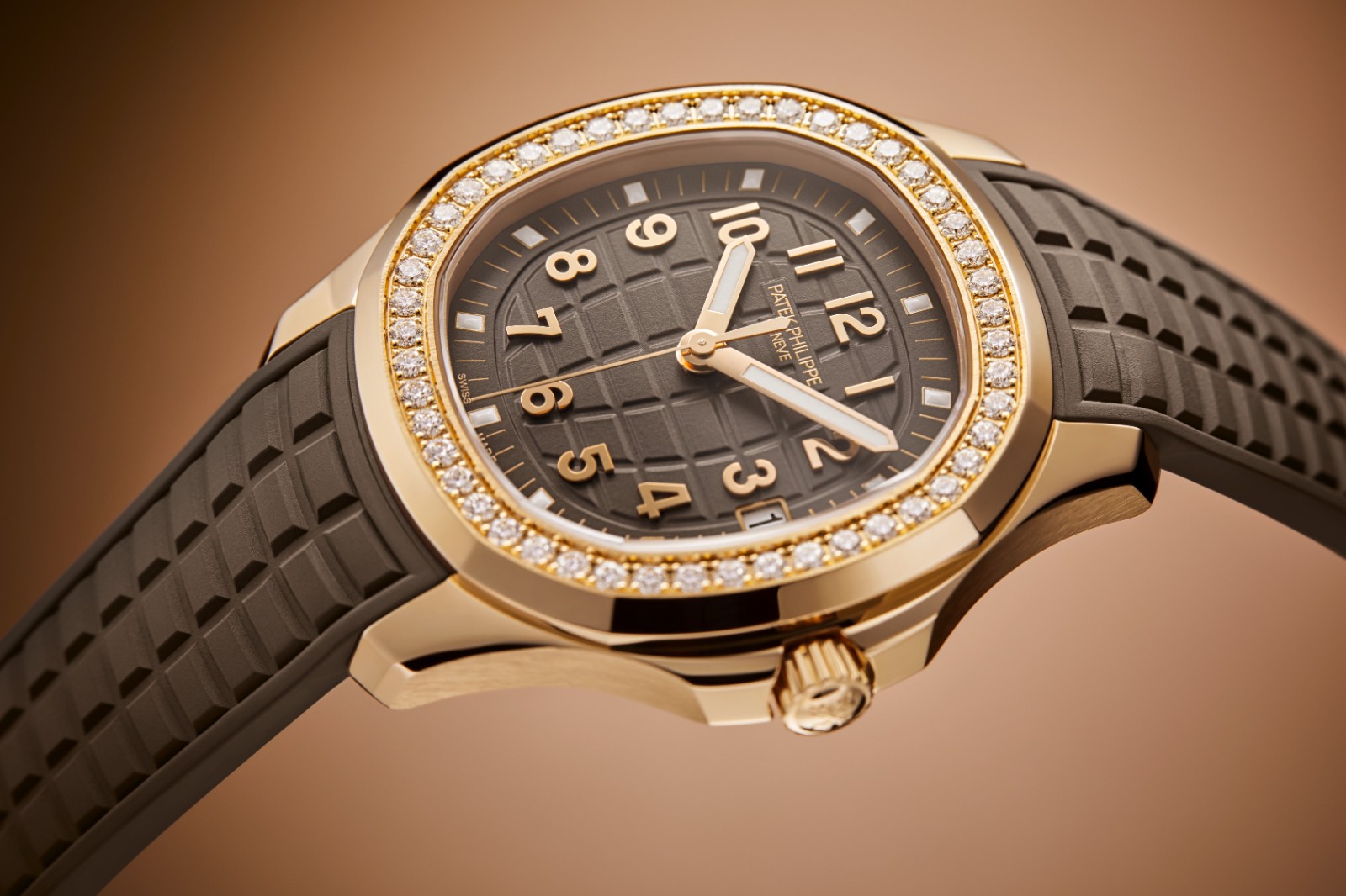 Aquanaut Luce系列的另一新款時計,編號5268/200R-010自動上弦女裝腕表,配備玫瑰金表殼,搭配灰啡色表面和一體成型表帶。灰啡暖和色調,介乎啡色與灰色之間,與這款時計「現代悠閒時尚」風格合襯。八角圓潤特色表環鑲以48顆鑽石,綻放光芒。