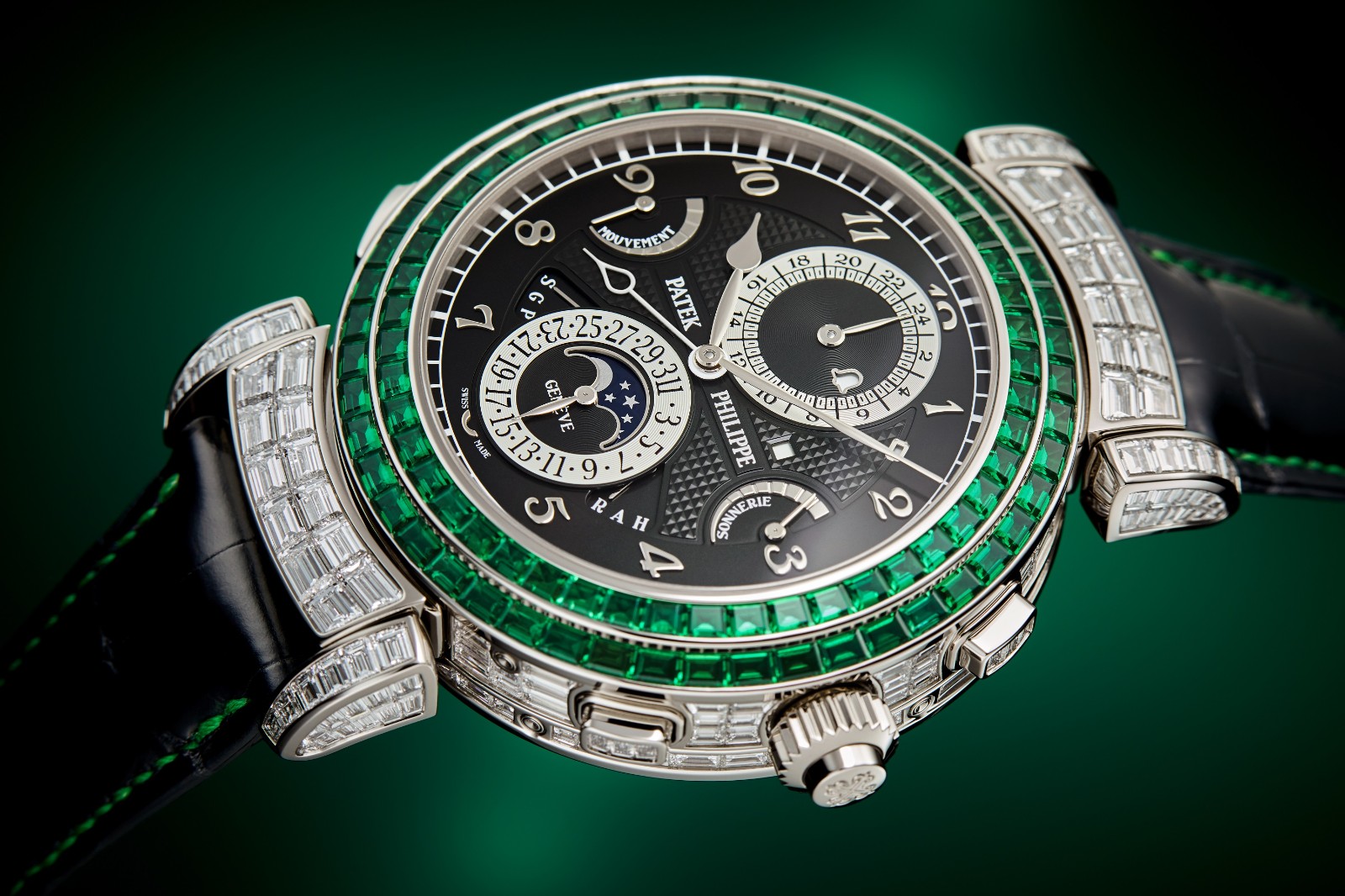 繼2022年推出兩款寶石鑲嵌款式後,品牌今年再次連結鐘表與珠寶元素,締造新款6300/403G-001報時珠寶腕表。新款腕表添上118顆長方形綠寶石(7.87卡)和291顆長方形鑽石(20.54卡),時計搭配兩枚乳光黑檀木色表面,其中時間顯示表面由人手綴以巴黎飾釘圖案,設計別致。