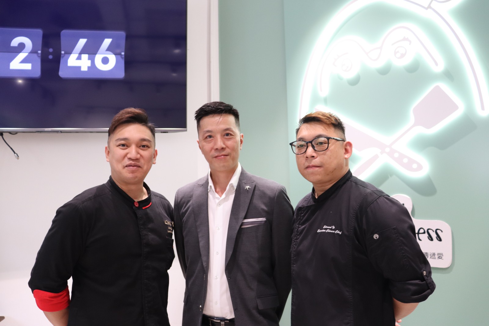 (左起)紅花會行政總廚葉世昌師傅、食物廚房劉師傅、如心酒店中菜行政總廚葉振文師傅。