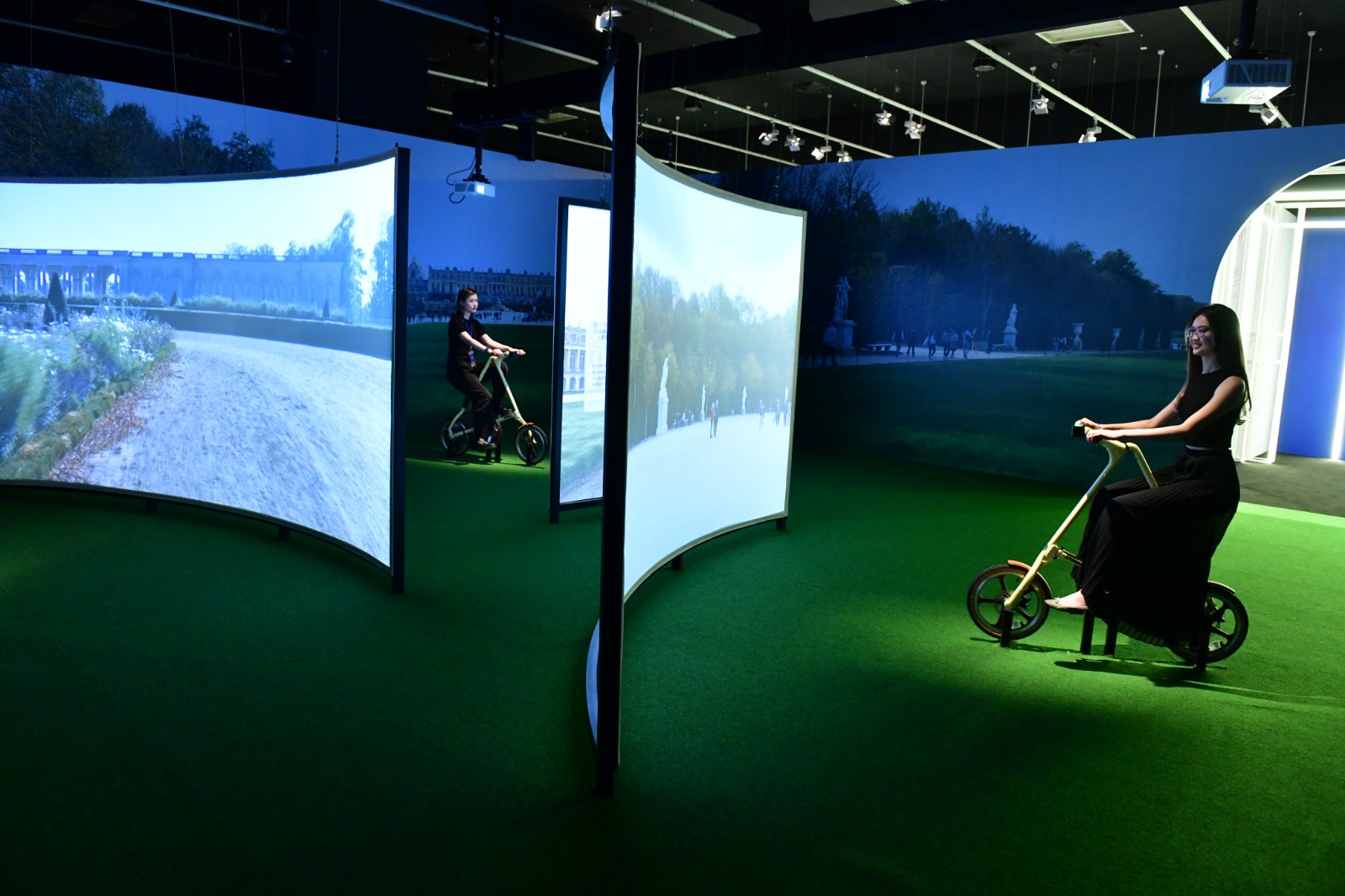 除聽覺和嗅覺外,展覽亦有觸覺和視覺體驗。在「自然景觀」展區,可踏上互動單車,漫遊宮殿獨特的園林景致,欣賞這座世界遺產的自然美態。再走進廳內,設有「凡爾賽宮3D畫廊」,戴上VR眼鏡便可360度瀏覽宮內的精選建築,如王家禮拜堂、王后小莊園和王家歌劇院等的建築細節。「即使親臨宮殿,6至8米高的天花板若不帶望遠鏡也難以觀賞,這次展覽能看到天花板裝飾的細節。」