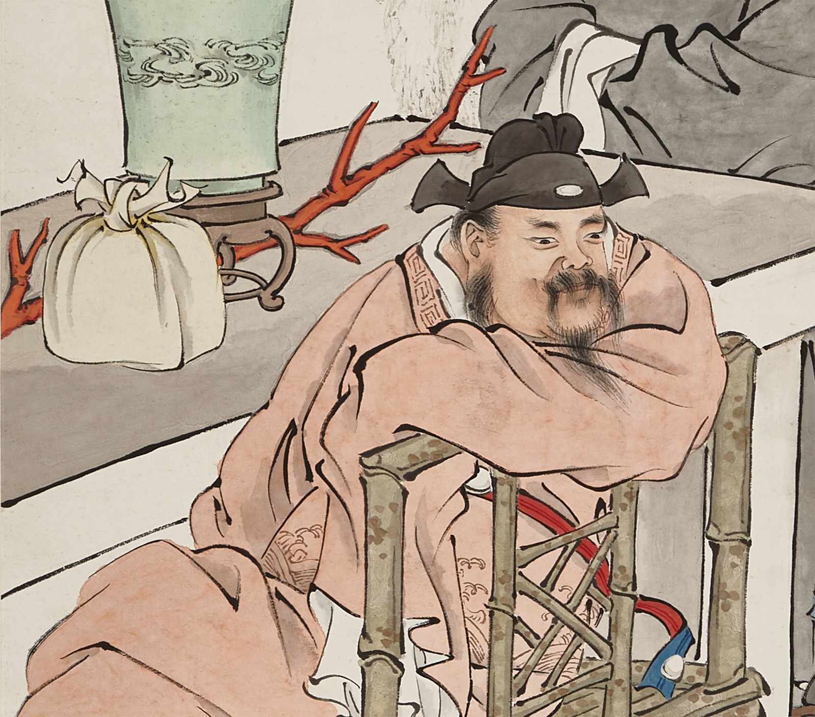 畫中人物神態生動細緻,鬚髮纖毫畢現。衣紋線條簡練、勾寫有力,起筆多頓點,用富有裝飾性的釘頭鼠尾描形成了節奏韻律。圓鼎上的複雜紋理以細筆刻畫,一絲不苟,竹椅的斑駁質感也以墨點繪製出來,呈現出畫家精湛純熟的功力。用色上近似任伯年的明淨淡雅,但色調更顯沉厚,頗有古樸蒼勁之感。桌上盆栽以沒骨畫法為主,淡墨層層暈染,表現出葉片的柔韌感,樹枝以水墨雙勾,填以朱紅色,筆法灑脫,渾然天成。