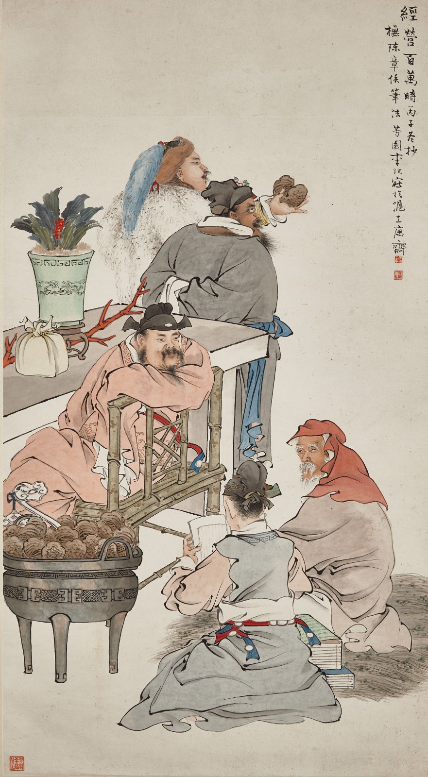 此畫筆墨簡逸放縱,豐富多變,兼工帶寫;構圖新巧,疏中有密,虛實相間,濃淡相宜,有強烈的敘述感和文人畫意趣。畫家在任伯年的基礎上發展出屬於自己的繪畫風格,在人物刻劃和色彩運用上受近現代的西洋畫影響,呈現出速寫感和水彩色調的風格。人物面部結構的造型趨於寫實化,圓鼎以顏色的對比做出了金屬質感。此畫表現出中國傳統水墨畫的筆墨精髓,又注入了時代的新鮮血液,是繼承傳統而推陳出新的一大力作。