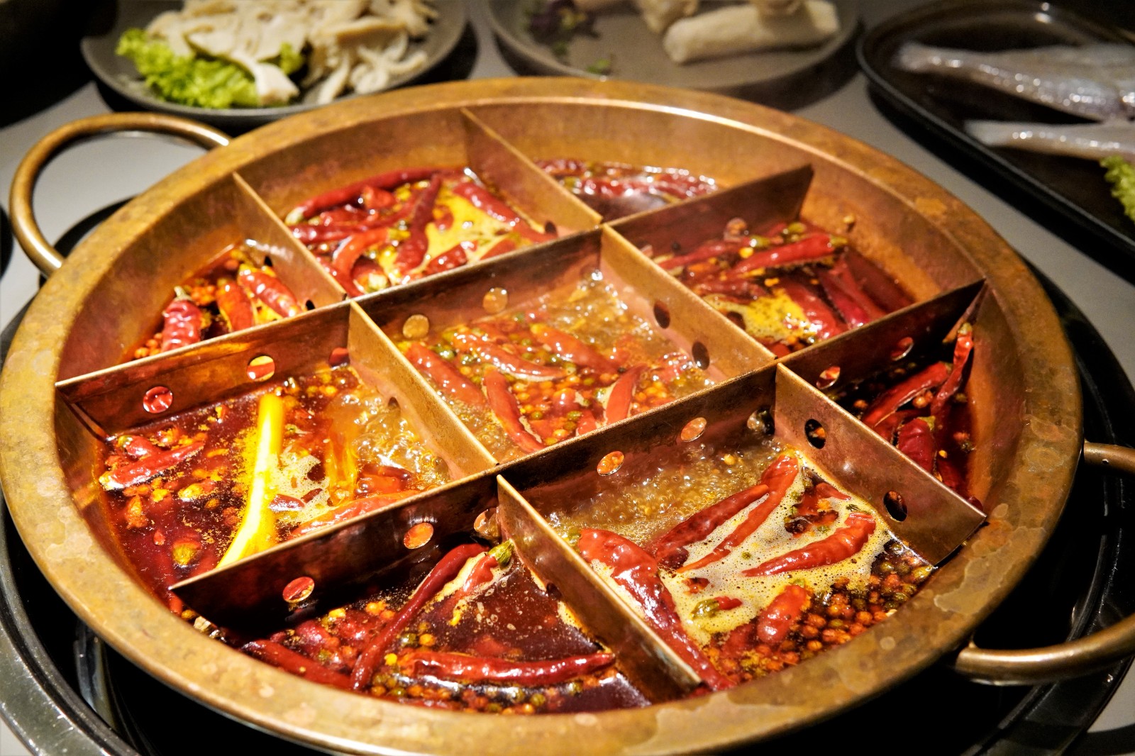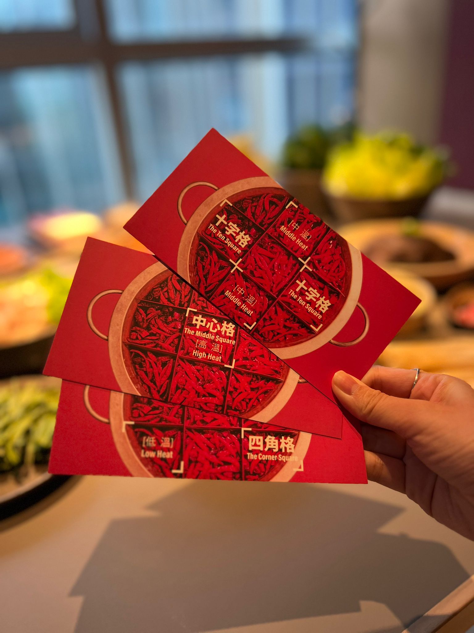 重慶老火鍋最重要是麻和辣,店舖選用重慶石柱紅頭茬辣椒、漢源花椒,再加上等牛油及郫縣豆瓣醬、雲南黃口老薑等幾十種香料,經40分鐘不斷炒料才熬製成湯底。而「九宮格麻辣大紅鍋」不同分格溫度有所不同,主要分為中心格、十字格和四角格,烹煮食材時,放進正確的分格,才可嘗到食材的鮮味。如中心格火力最旺,不宜久煮,適合毛肚、鵝腸、牛肝、肥牛等;十字格火力稍弱,但卻均勻,適合麻辣牛肉、耗兒魚、黃喉、豆皮、蔬菜等,鎖住食材原香;四角格火力小,較適合炆燉,如煮腦花、鴨血、鵪鶉蛋等,軟腍入味。