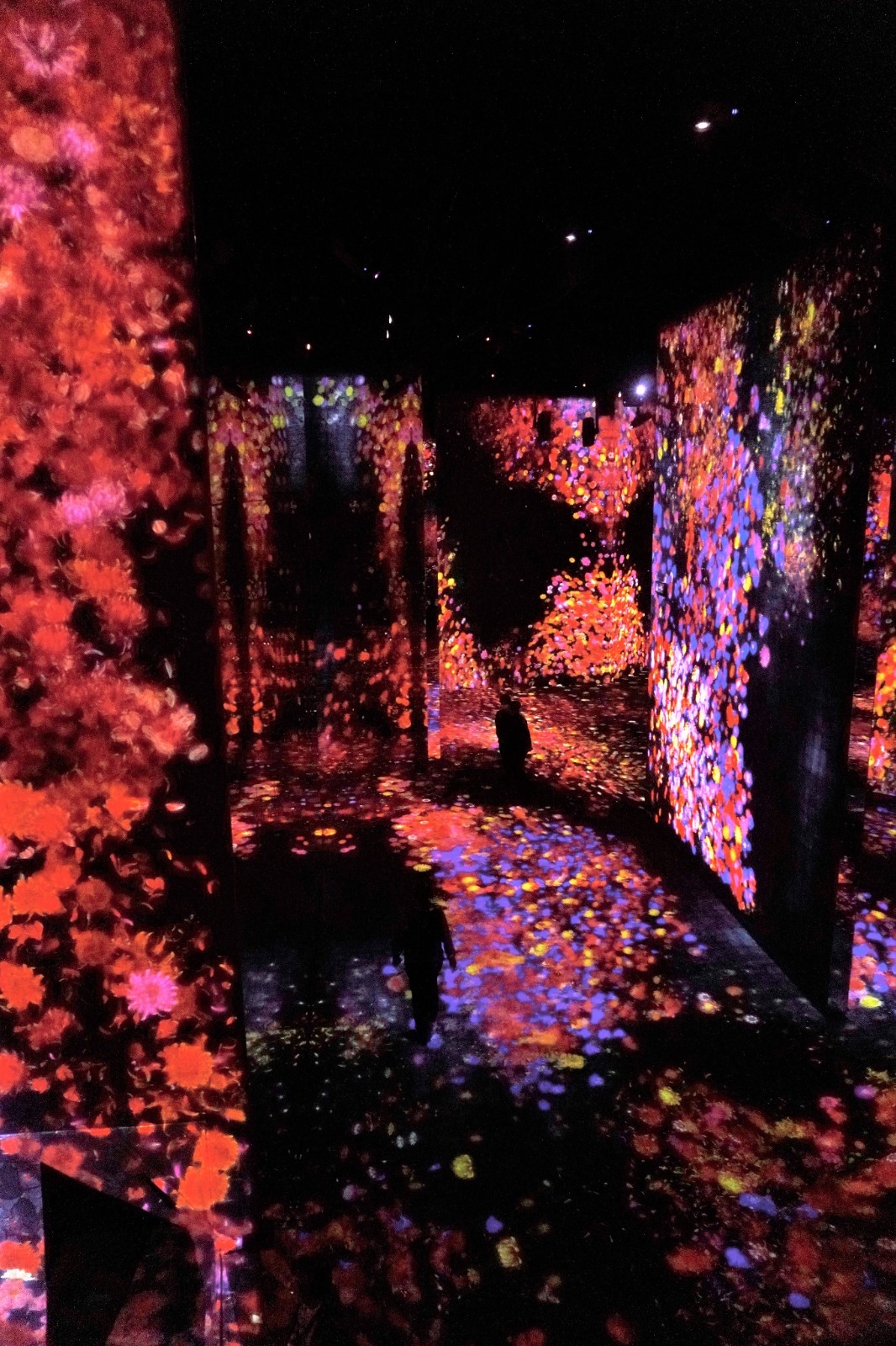 展覽空間由高度8米的巨型作品群構成,面積5000平方米,場地設計複雜且具高低差,加上環境昏暗,容易迷路,筆者建議事前了解各個展覽空間特點,衣着以白色或淺色為主,便能參觀得更盡興。在寬敞的環境中,通過巨型作品探索人與自然的關係,將身心靈沉浸其中,甚至與作品融為一體,讓人重新定義自我與世界間的界限。3組全新展示空間包括由8000朵各種蘭花充填而成的「漂浮的花園——花朵與我同根同源,花園與我合為一體」,策展團隊使用了特別技術以保存鮮花,空間內充斥花香,並會在早、午、晚不同時段散發不同層次的香氣。懸在半空的花會隨着觀眾走動而升起下降,加上四周採用鏡面設計,恍如被花朵包圍,與植物融為一體。「無相之雲,雕塑與生命之間」展示空間被肥皂泡填滿,巨大的白色團塊從泡沫海中誕生,漂浮再於半空靜止,隨着扇風和觀者走進,團塊破碎成一小塊,讓人思考生命的意義。在「EN TEA HOUSE」(茶屋),工作人員斟茶後茶杯便會綻放花朵,只要還有茶水,移動茶杯,花朵依然跟隨移動並不斷地盛開,隨着茶水的增多或減少,花朵的大小也有所變化,喝完杯中茶,花朵便會消失,暗喻這一瞬間的畫面錯過後無法再看。每一個空間展示透過不同的互動方式,令觀者產生獨特的感官體驗,與藝術相融。