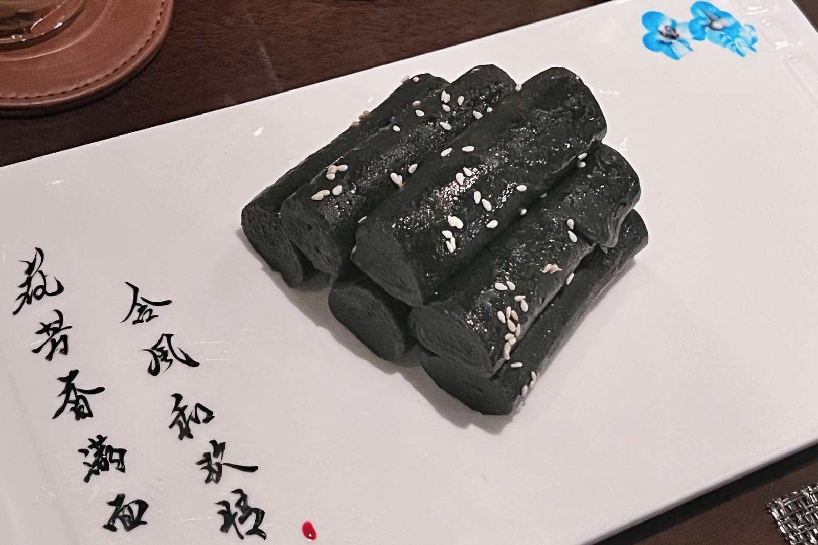 「懷舊生磨黑芝麻卷」,盤上寫上細勁清雅的書法,芝麻卷質感滑順,帶有濃郁的芝麻香味,將美食與藝術共冶一爐。