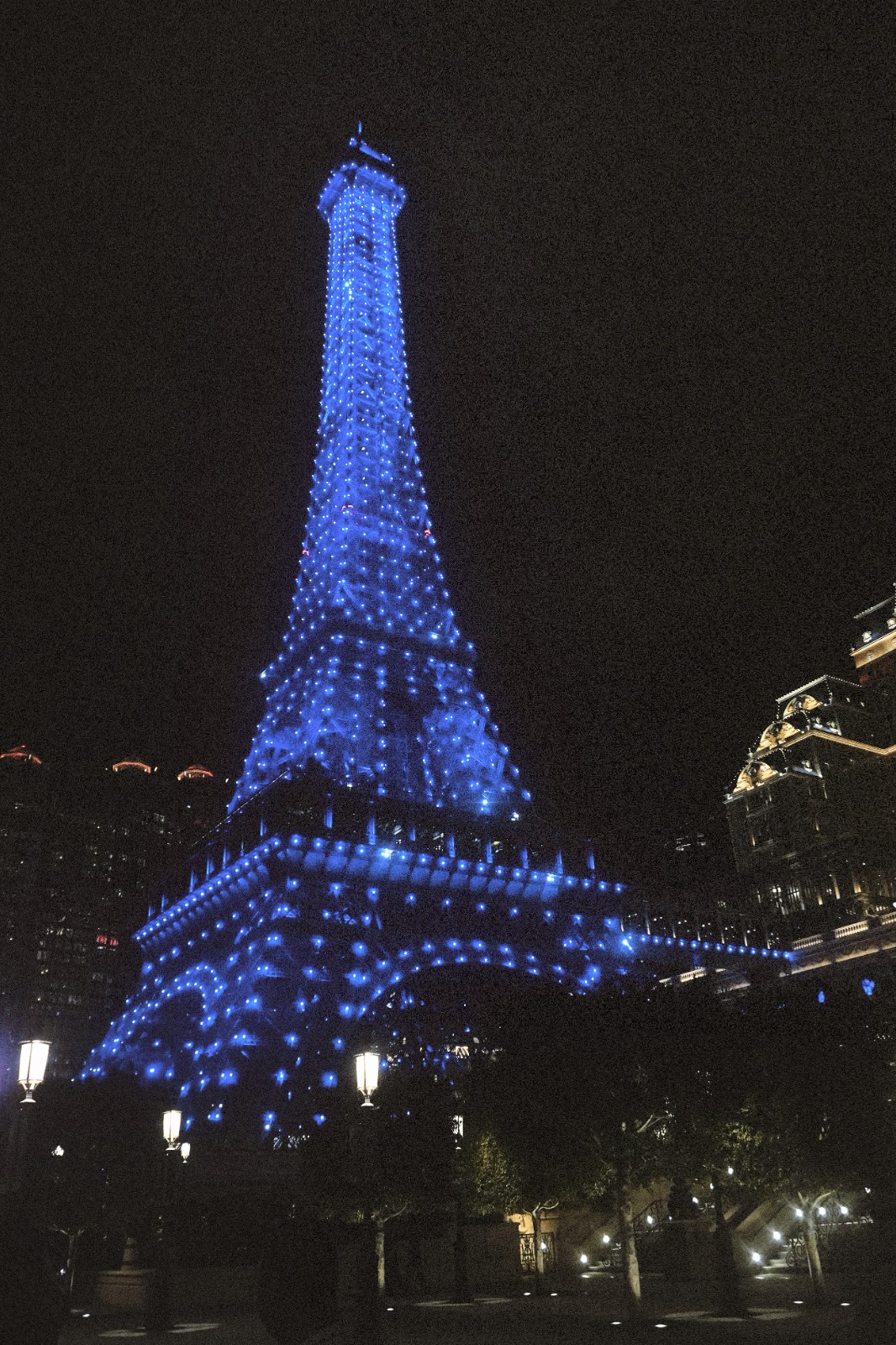 鐵塔日夜景色各有不同風情,晚上有燈光表演,在閃爍絢爛的燈光襯托下,鐵塔更奪目。