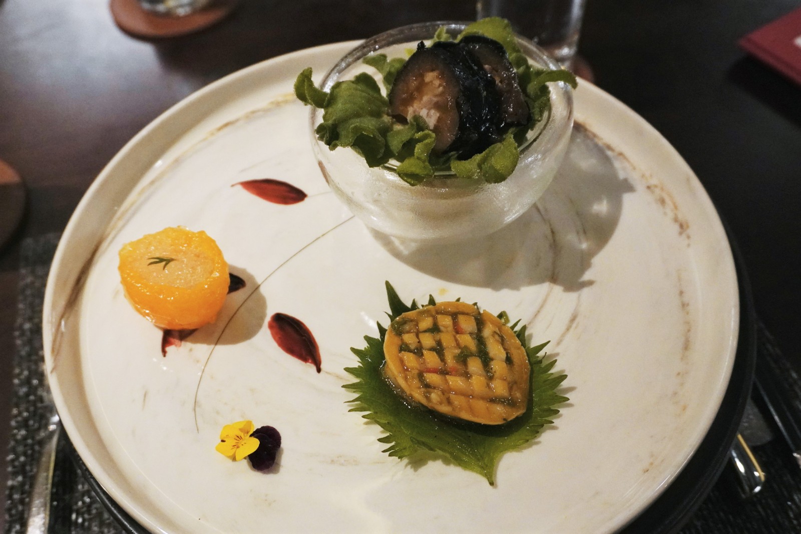 巴黎軒精緻三拼的擺盤富藝術感,包括黑金韓參釀水晶豬蹄(上)、燒椒拌低溫慢煮鮮鮑魚(下右)、雲南樹蕃茄配雪燕(下左)。