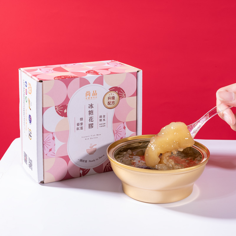 品牌推出的即食花膠有冰糖和酒釀兩款口味,採用日本「高溫高壓滅菌技術」,無需放雪櫃。前者內含2至3隻深海花膠,肉厚Q彈,還有紅棗、藜麥等健康食物,味道清甜,養陰生津,補腎、潤肺止咳,美顏健脾,兼可提升皮膚彈性及水份;後者內含花膠、桂圓乾、枸杞等健康食物,口感豐富,配以米酒釀成,更滋補養顏。燕窩飲品亦有冰糖和花旗參兩款,採用了馬來西亞燕窩,含豐富的膠原蛋白及氨基酸,冰糖味口感香甜幼滑,啖啖燕絲,潤肺補氣。花旗參味能改善疲勞狀態,養氣補氣,味道甘香,營養價值高。