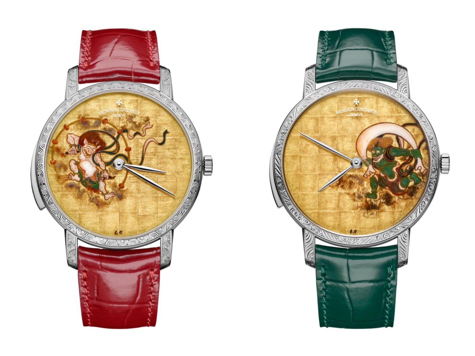 去年在威尼斯的Homo Faber展覽上首次亮相的這兩款Les Cabinotiers腕表,靈感源自17世紀日本國寶級繪畫大師俵屋宗達的代表畫作《風神雷神圖》。大師以水墨和彩色顏料,在金底二曲屏風上勾勒出栩栩如生的風神和雷神形象。如今,這兩位神靈分別刻畫在兩枚全新Les Cabinotiers閣樓工匠腕表的表盤上,由品牌的琺瑯大師和雕刻大師以精湛手工打造,表殼則以珠寶鑲嵌工藝精心裝飾,兩款超薄腕表均搭載了備受鐘表愛好者與收藏家青睞的1731機芯。