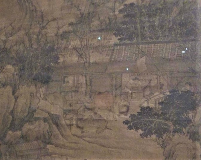 這幅南宋的《盤車圖》所繪內容與表現手法甚為寫實。畫面中層巒疊谷、叢林幽翳。一家客店坐落於山中,店前有糧車停靠、駝隊歇息。另外兩輛滿載貨物的牛車被車夫、商販驅趕着,在崎嶇的山道中朝着客棧緩慢前行,似乎是希望趕在夜幕降臨前投宿。