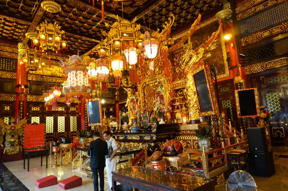 因此,是次開放大殿供公眾參觀是難得體驗。殿中主祭壇供奉黃大仙仙師之畫像,就是梁仁菴道長從西樵山攜來的畫像,殿內亦供奉了護法神齊天大聖及地主。在黃大仙仙師畫像前方,懸掛鎮祠寶劍,這劍自1921年開壇時懸掛至今。主祭壇背後刻有鍍金木雕,載述了黃大仙得道成仙之事籎。殿內牆壁更裝上儒、釋、道三教的木刻經文和圖畫,展示道家兼容三教的思想,饒富意義。