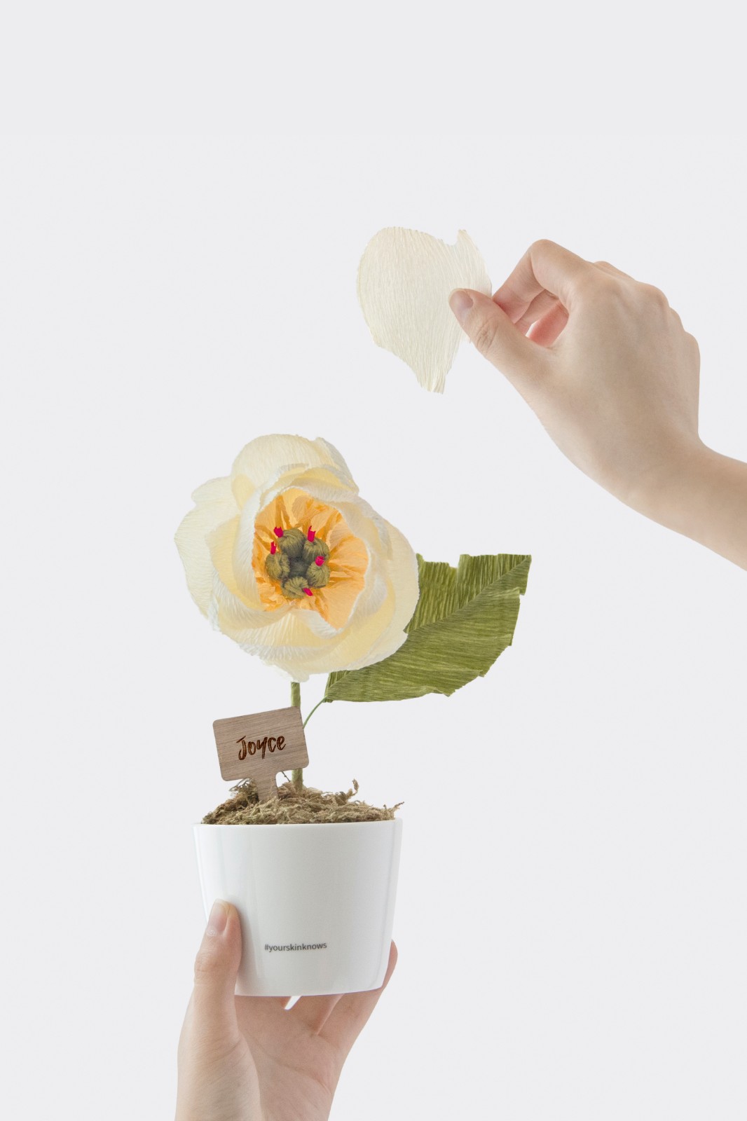 紙花以品牌原液調配庫中的paeonia extract得到靈感,該產品除嫰膚養肌外,還充滿美好寓意。「暮春紙花工作坊」是以個人形式進行,簡單依照教學影片方式,隨自己愛好及心情為紙花塑形,製作出獨一無二的紙花盆栽,讓春天的花朵在手中永恆盛開。