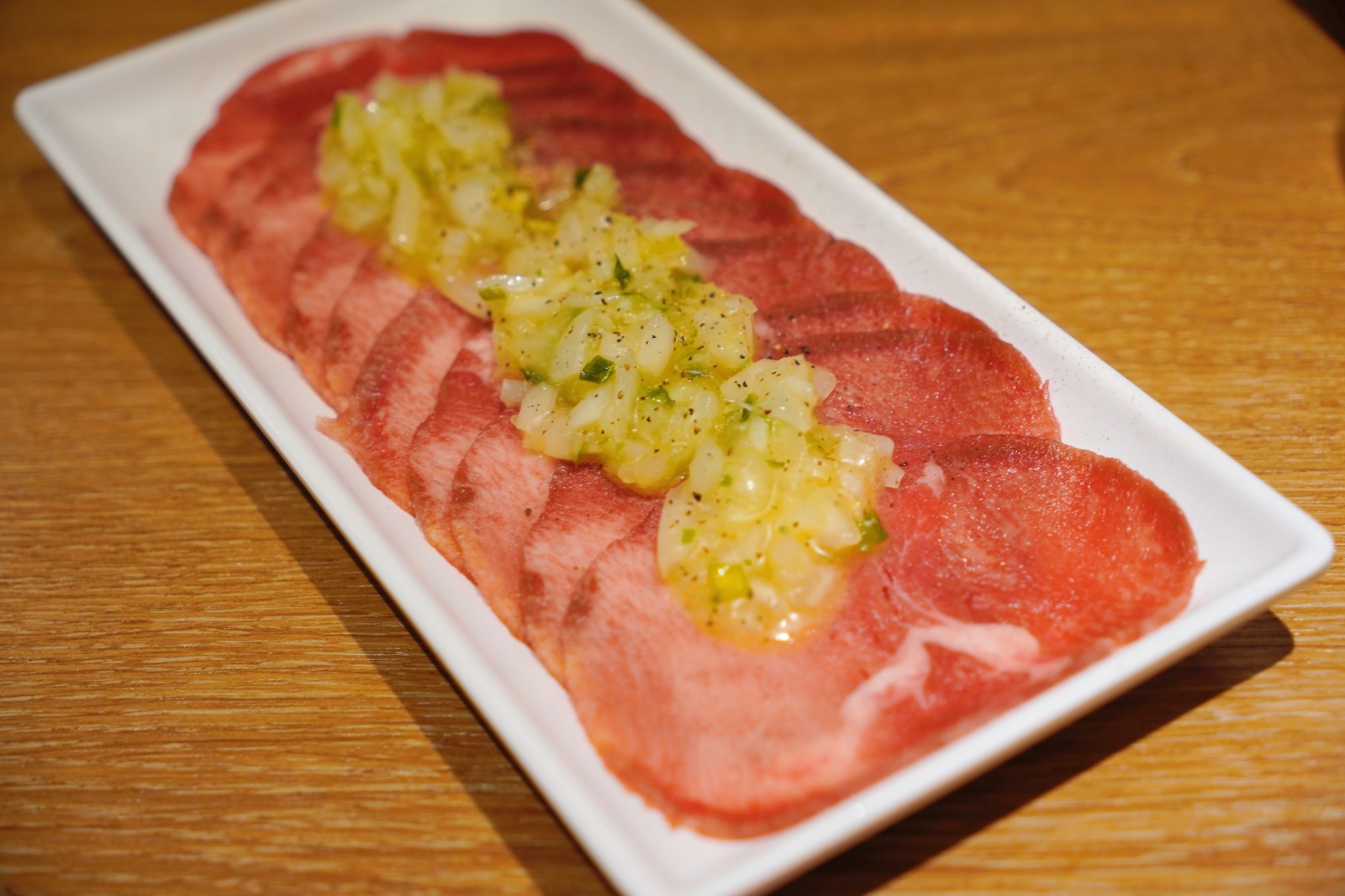 「鹽蔥牛舌」,HK$50(50g)/ HK$78(100g)。即日起至11月5日,惠顧任何主餐目正價套餐,可以優惠價追加鹽蔥牛舌單品,限時優惠價HK$38(50g)/ HK$65(100g)。