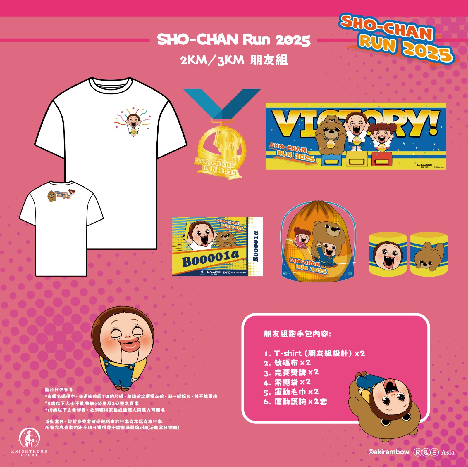 報名參加活動,並可獲SHO-CHAN主題跑手包。報名個人組或朋友組的跑手,均可獲SHO-CHAN主題T-shirt、運動毛巾、號碼布及索繩袋;個人組跑手額外贈送SHO-CHAN水樽,朋友組則額外贈送SHO-CHAN運動護腕。寵物跑手內有SHO-CHAN主題寵物雨衣、便攜式寵物便便袋及寵物水樽。完賽的人寵健兒並可獲「SHO-CHAN RUN」紀念獎牌,記錄跑手與寵物的努力和汗水。除選手包外,參加者亦可自由加購其他限定產品。