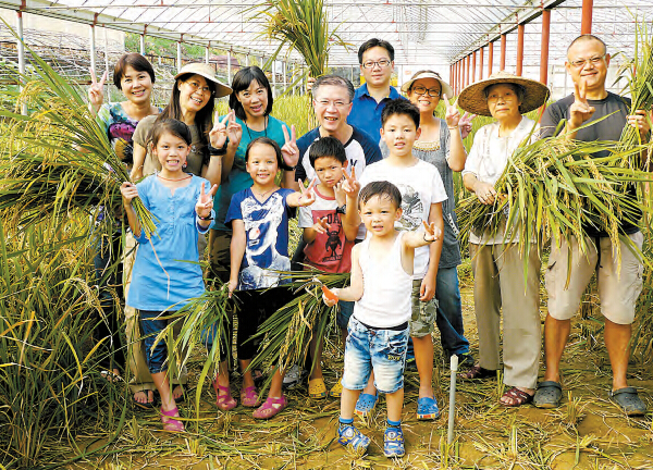 吳炳良(右)與妹妹吳碧雲(後排左三)及媽媽(右二)是農場主力,親友閒來也幫忙種植。有心機農場提供圖片